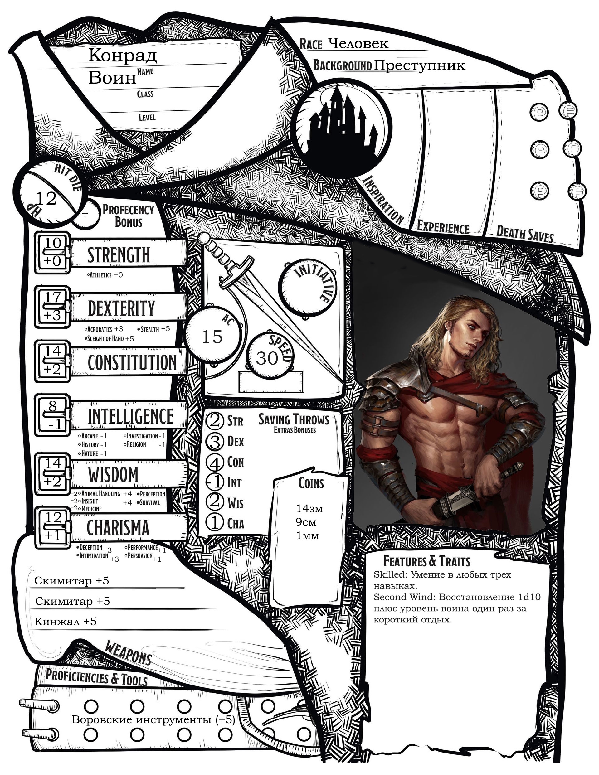 Эльф-Клирик ур. 3 ранения ● Сил 10 Лвк 13 Тел 23* Инт 10 Мдр 8 Хар 16