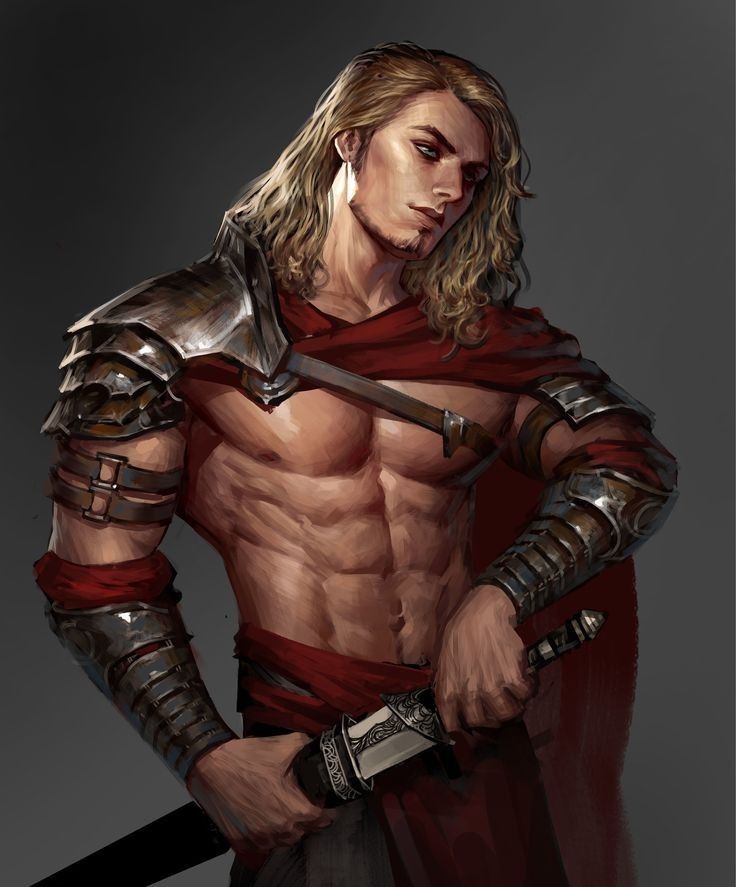 Тусклая бронзовая броня на Шариме была достаточно лёгкой и закрывала не всё тело. Так, например, накачанные икры ног оставались сзади открытыми, а под нагрудником болталась свободная майка, из-под которой выглядывал накачанный торс. Аврил уступала своему спутнику в росте на где-то полторы головы, и сил чужеземцу было явно не занимать — если кто-то и мог поквитаться с орком, то только кто-то такой конституции и из такой весовой категории. С собой же на поясе в ножнах Шарим имел широкий двуручный меч, которым явно можно было не просто заколоть, но зарубить человека на раз-два.