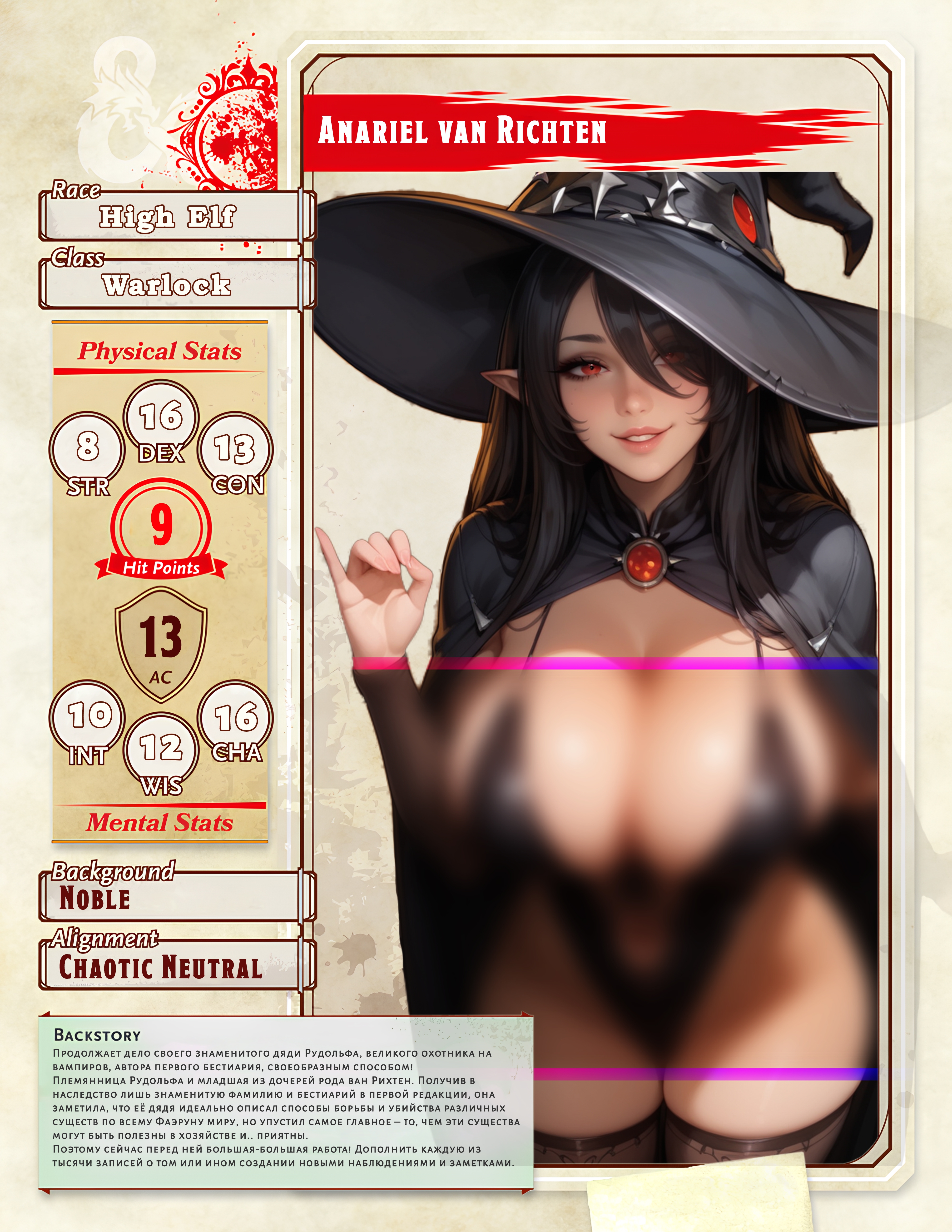 Продолжает дело своего знаменитого дяди Рудольфа, великого охотника на вампиров, автора первого бестиария, своеобразным способом! Племянница Рудольфа и младшая из дочерей рода ван Рихтен. Получив в наследство лишь знаменитую фамилию и бестиарий в первой редакции, она заметила, что её дядя идеально описал способы борьбы и убийства различных существ по всему Фаэруну миру, но упустил самое главное – то, чем эти существа могут быть полезны в хозяйстве и.. приятны. Поэтому сейчас перед ней большая-большая работа! Дополнить каждую из тысячи записей о том или ином создании новыми наблюдениями и заметками.