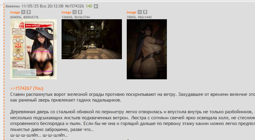 >>1592159 Это наивная гномиха решила, что её наняли убраться в шкафу для обычных болтливо-потворствующих магических зеркал, но она не знала, что те зеркала на самом деле были карманными червоточинами, ведущими в штаны к мужланам различных мастей, рас и степени дурнопахучести.