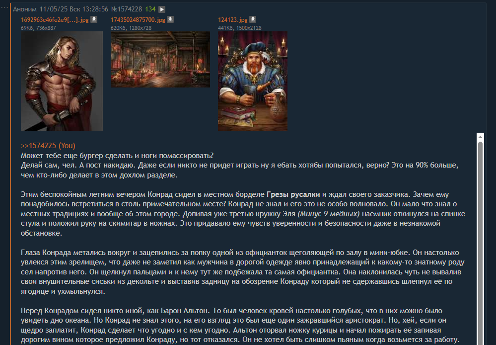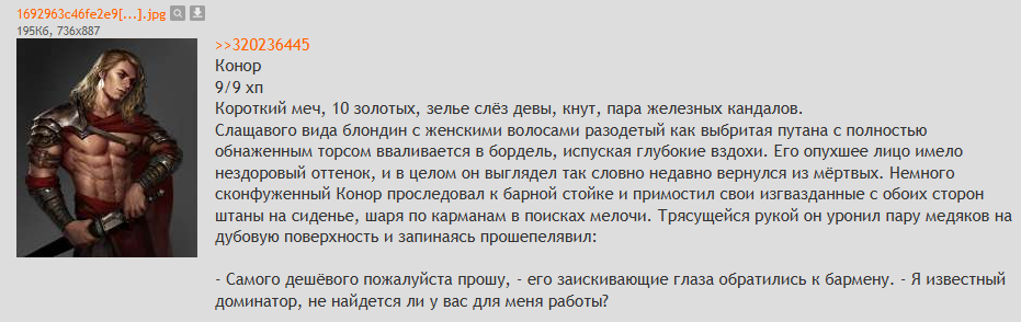 >>1591134 — Две сотни монет? Чтобы я прямо сейчас не пойми куда попёрся на ночь глядя? — раздражённо фыркнул наёмник, явно не желающий отрываться от приятных дел. Это же одеться надо, выйти, выяснить про работу, а ещё потом куда-то топать напрягаться, хотя сегодня должна была быть ночь отдыха и блуда... Ужас какой! Мысли об этом всём вызывали у громилы чуть ли не головную боль. — Никуда я сегодня не пойду ни за какие деньги, — после длительной паузы постель проскрипела от того, что с неё встали. Наёмник приблизился к двери, приоткрыл её и уставился сверху вниз на жрицу совершенно взбешённо. — Только идиот пойдёт к чёрту на куличики затемно! Знаю я эти ваши неожиданные ночные экспедиции, которые кончаются нередко грабежом. Прикрываться "убийца тварей" даже и не думал. Скорее наоборот — стоял в дверном проёме с болтающимся меж ног достоинством без каких-либо зазрений совести. — Я бы, мо-о-ожет, подумал, если бы ты прямо сейчас упала на колени и отсосала бы мне, но что-то подсказывает, что это в твои планы не входило, — пренебрежительно фыркнул смуглый мужик. — Приходи завтра утром.