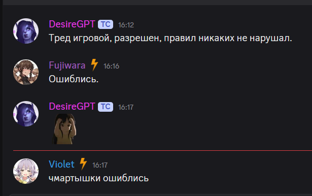 >>1579469 >мне понравилось с ним играть. Аналогично. Миленькая моэ девочка!~ ///-/// >но если бы ты отписался, то как минимум бы ответил что не хочу/могу играть. Да это моя ошибка, уже извинился, ничего не поделаешь уже. >Не знаю насчет дискорда, как-то стремновато 1х1 идти с кем-то малознакомым... Вытащу цифровой нож и заколю тебя?~.. Что стрёмного-то, никогда не понимал этой фобии. Если тебе человек не понравится - просто скажи что не сошлись, и заблокируй.