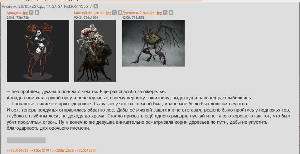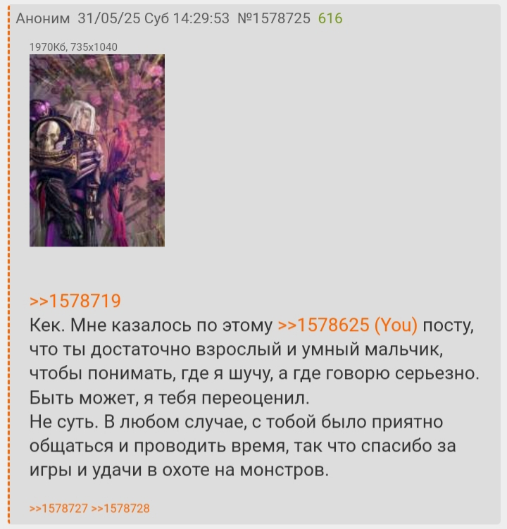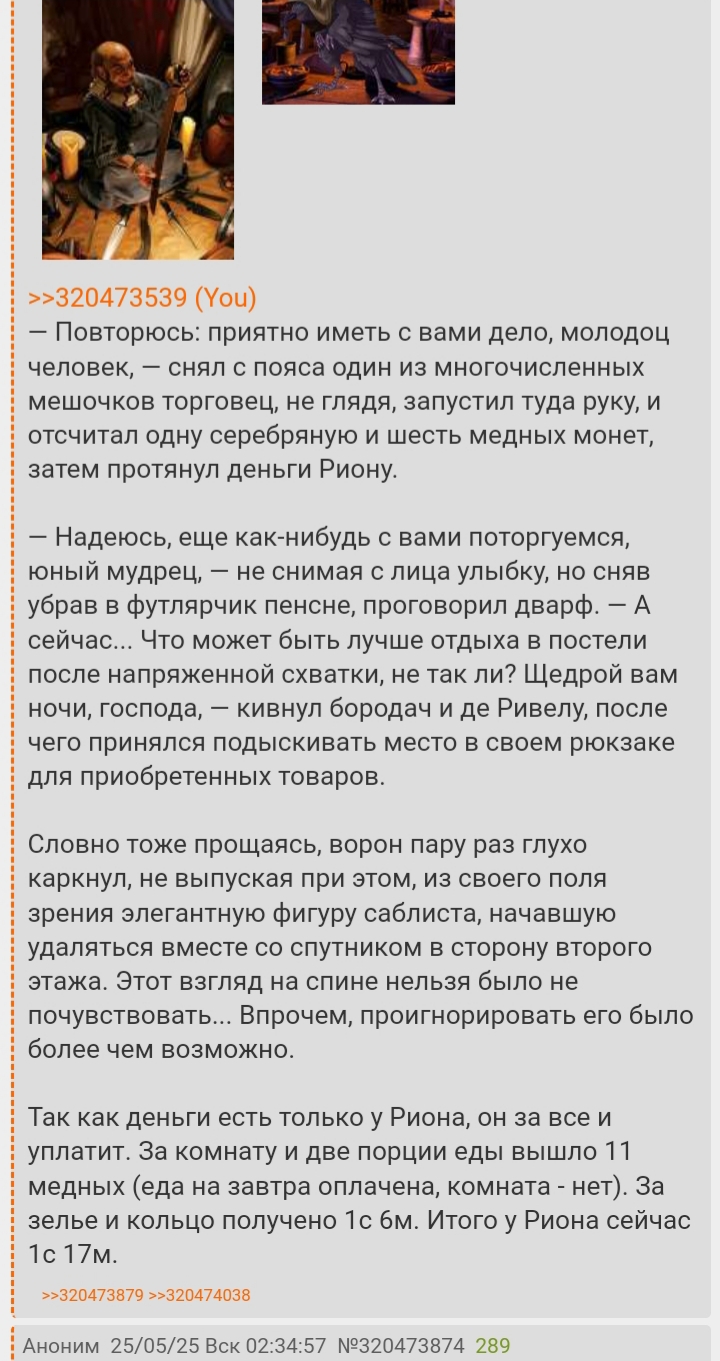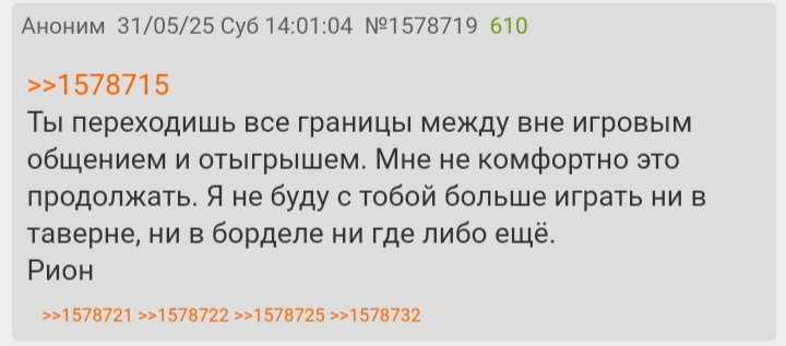 Арно, если ты это прочитаешь, то прошу прощения за игнор. Совершенно честно проглядел твой пост на фоне вайпа и срача, а потом еще и пролистывал, не замечая, пару раз, когда между другими прыгал. Если такое случается, лучше напоминать о себе ГМу юшкой, потому что он и правда может банально >забыть/не заметить/етц. В общем, если еще вернешься, буду готов доиграть поход на эльфа.