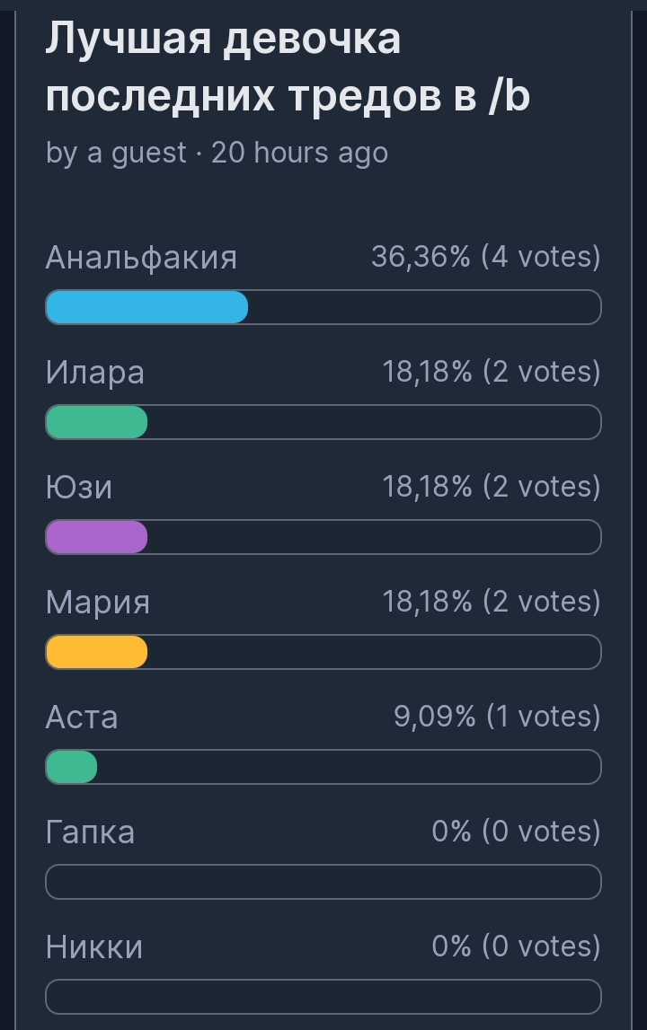 Картина складывается в целом неоднозначная и в некотором роде неординарная. Можно увидеть как вопреки всем ожиданиям итоги приводят к любопытным наблюдениям. Крайне важно уточнить, что голосование вполне объективно, проводилось честно, поэтому подтасовки и прочие непотребства конечно же исключены. Тем не менее имеем что имеем и могу сказать прямо только одно, без зазрения совести, без боязни быть осужденным, и все же, как бы это ни звучало, а я, между прочим, повторюсь, что скажу прямо и жестко и вы должны быть готовы это услышать: да, действительно все так, как есть, без исключений. Совсем. Примите это всей душой, живите с этим дальше, а может, не воспринимайте близко к сердцу если это вас не касается лично. Анальфакию люблю, то, что она пишет читать невозможно, но тем не менее читать надо. По итогам голосования видно, что я не один такой, хотя возможно это и тролли, хотя возможно это Факия балуется с разных айпишников, но я все же проголосовал за Иларочку няшечку верните завышенный пидоры блять. На этой ноте вынужден откланяться, если потребуется мое субъективное мнение еще когда-нибудь зовите, с удовольствием поделюсь, всех люблю целую (в щечку).