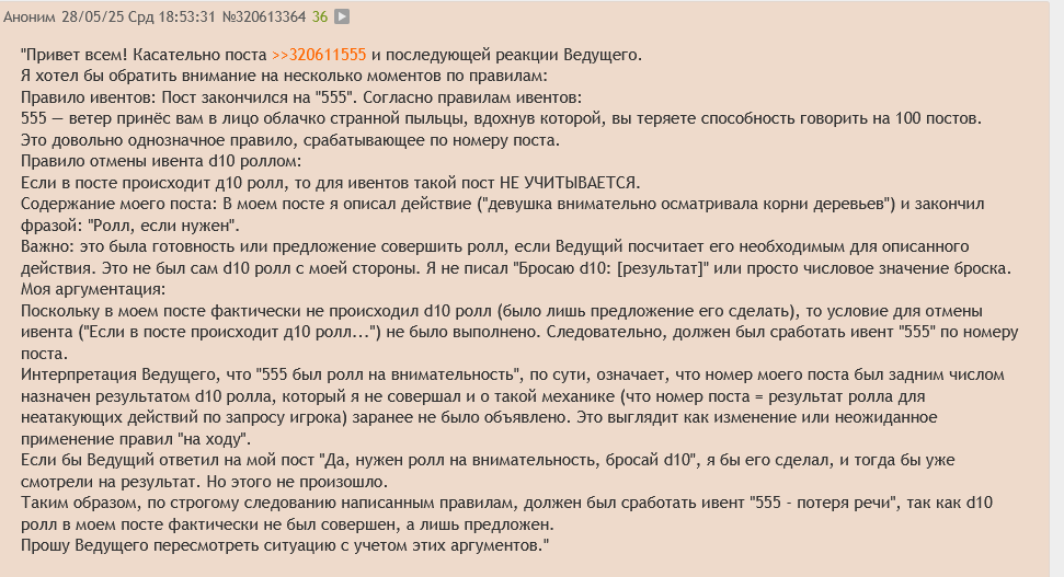 Правила треда: 1. Запрещен пиар конференций. 2. Помехи играм, а именно: локальные шизофорсы (сортиры, скайнеты, самоподдувы, и прочие), вайпы, откровенно вредящие ходу игры действия будут наказываться. 3. Дискриминация игроков, в том числе по признакам: олдфаг/ньюфаг, графоман/мелкопост порицается и будет наказываться. 4. Щитпостинг не приветствуется, а рецидивисты будут наказываться. Имейте уважение к сообществу. 5. Порицается разведение срачей в чьих тредах играть/не играть 6. ГМы могут не водить в своих играх буйных и/или серящих шизов, игнорирующих правила и сеттинг игрового треда