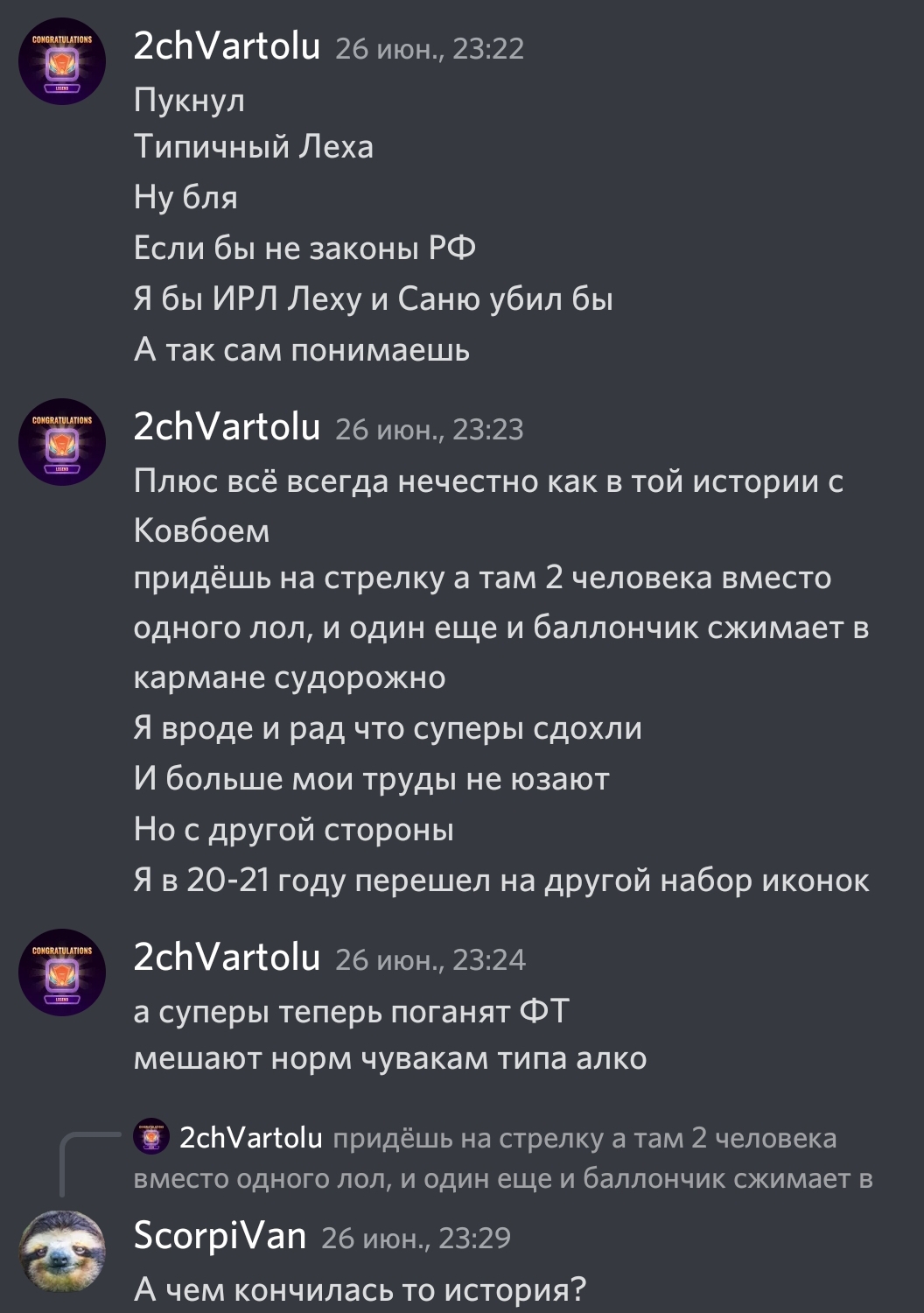 >Ежели в будущем у тебя появятся мысли, связанные или не связанные с игрой, которыми ты захочешь поделиться со мной, то можешь сделать это в т.ч. и здесь. По крайней мере, если тебе нужно будет обсудить это без вмешательства клоунов и семенов. В противном случае подойдёт и живой тред. Окей, договорились и сам об этом подумал. Подполье прям какое-то. Бтв, я не обращал внимание на игры Ангира до этого и подколы в его сторону не до конца понимал, а сейчас как понял! Планировать что-то, в общем, не приходится.