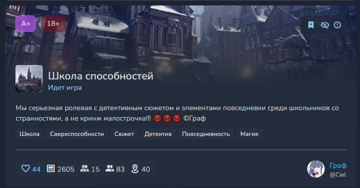 >>1597808 Я давно играл, и успел закончить историю своего одного персонажа, а других новых персонажей, которых придумывал, ими мало кто интересовался. Да и мне, честно, другие показались пресными, которые были после меня, и я ливнул. Иногда перечитываю старые ветки, хочется даже снова что-нибудь придумать, но потом все погасает на этапе задумки.