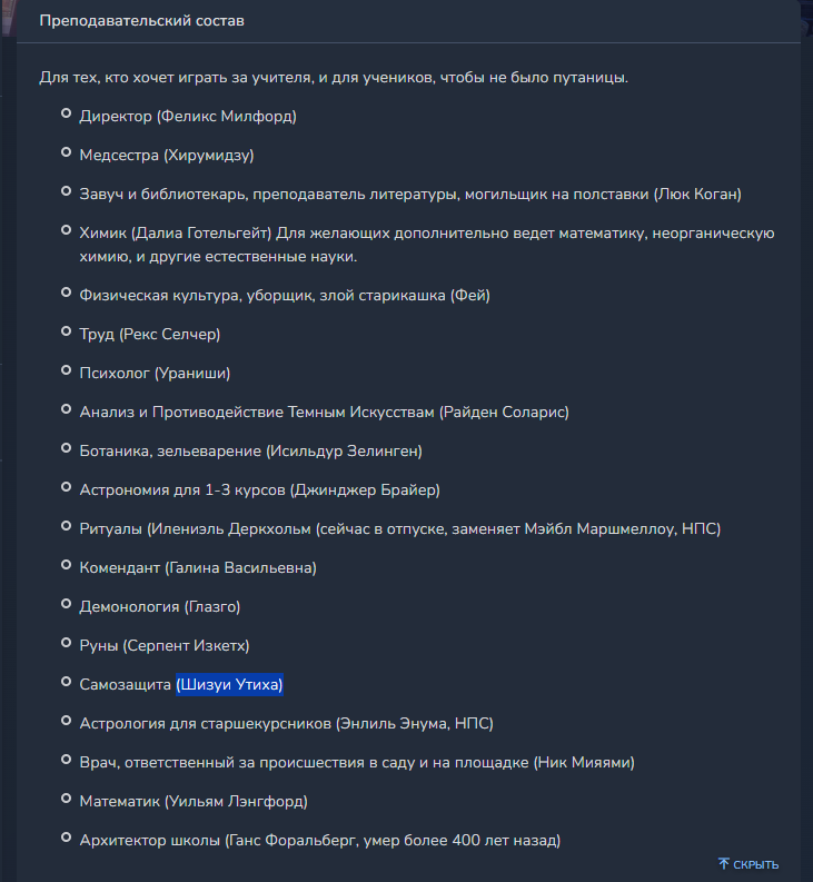 1. ГМ директор, который будет отвечать за весь связывающий и толкающий движняк. 2. Внятная сюжетная арка, в которую можно будет вписываться кому угодно по желанию в любое время. 3. Отыгровка персонажей за учеников, и учителей. За прогулы и плохие оценки будут наказания вплоть до исключения. 4. Небольшая рпг составляющая с сохранением прогресса персонажа. Статы и инвентарь. 5. Ежедневные треды в бэ.