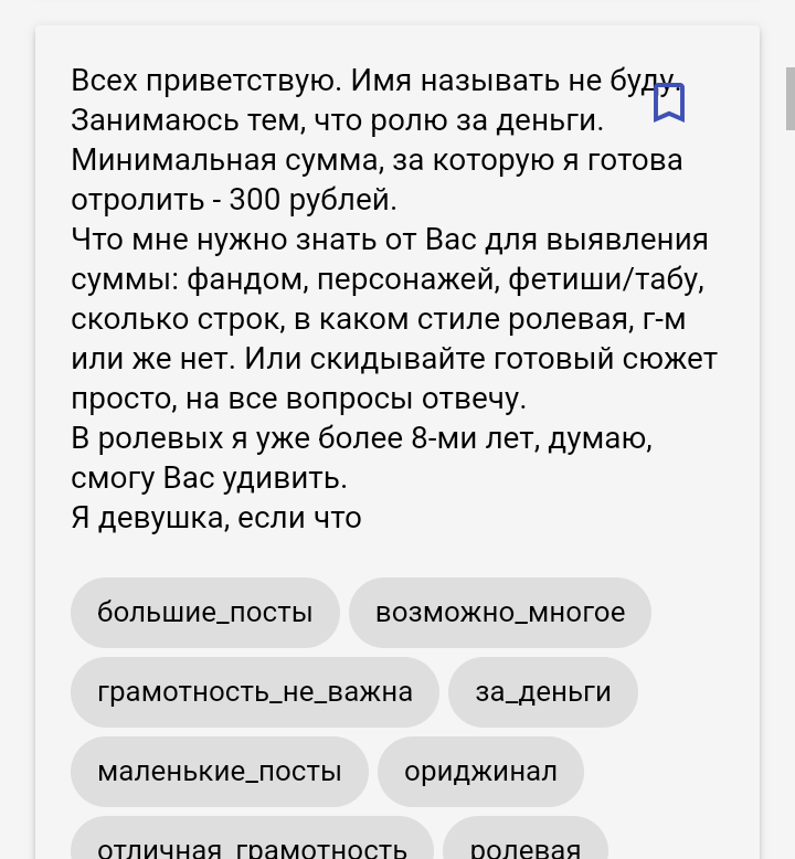 Ощущаю непреодолимое желание играть. Чувствую потребность мотивировать товарищей к запуску таверн, завышенных, разгульных и других игр в разделе /b. Всячески поддерживаю инициативу проведения подобных игр по выходным. Стремлюсь к совершенствованию собственного отыгрыша и вживления в роль, а также понимаю важность помощи новичкам.