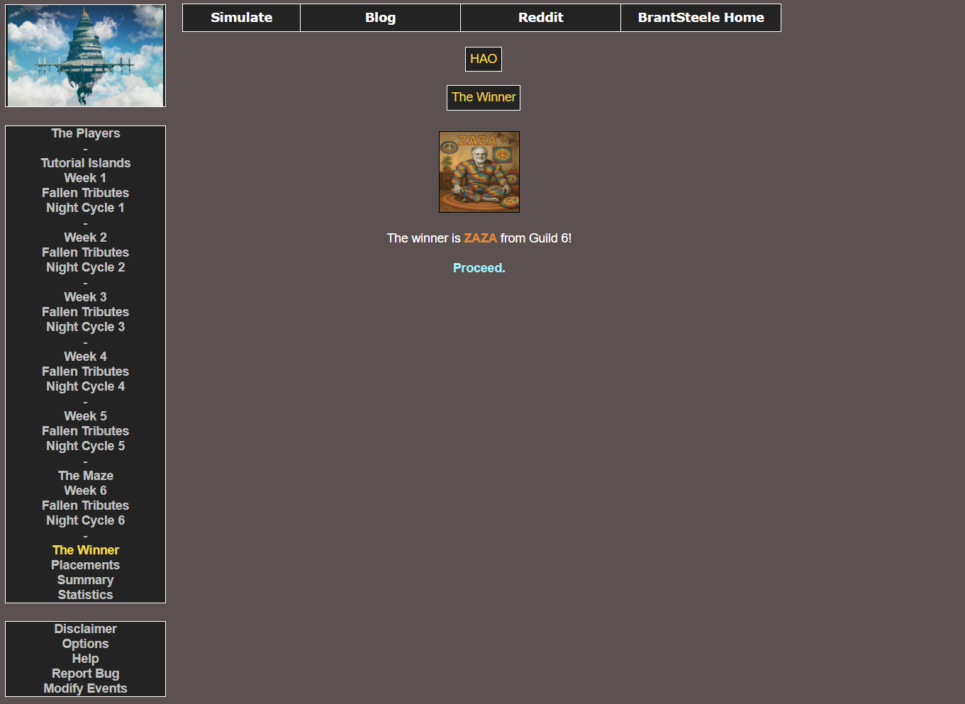 Победителем становится Заза, мои поздравления. Всем спасибо за игру, тем кто ушёл и тем кто остался. Если кто-то остался.