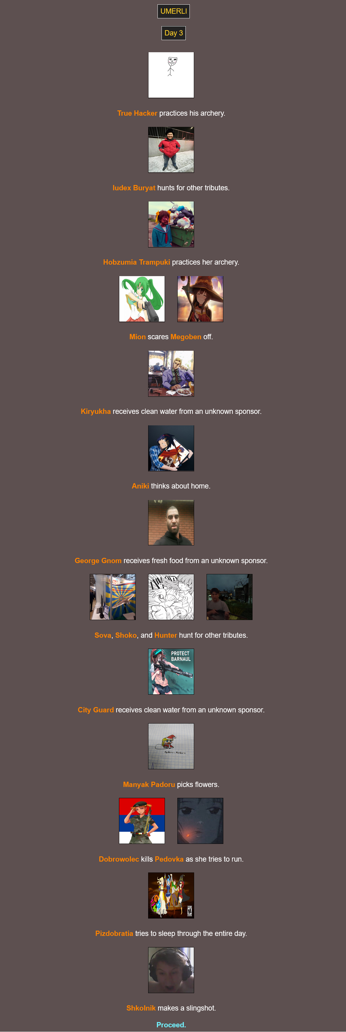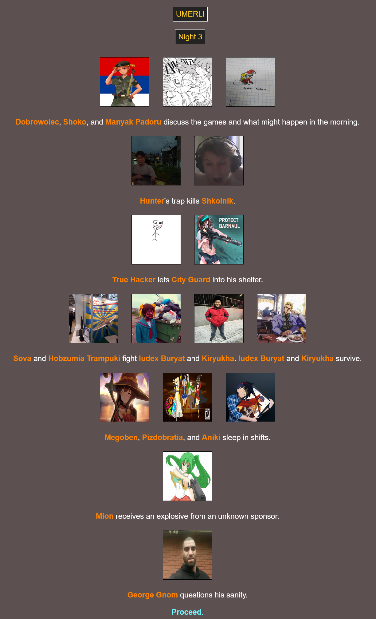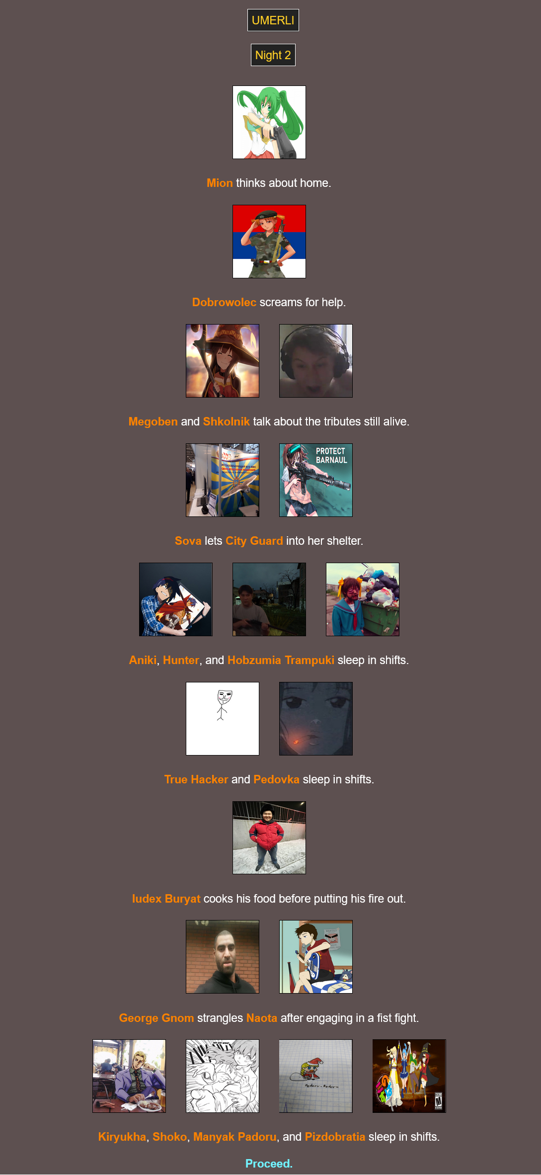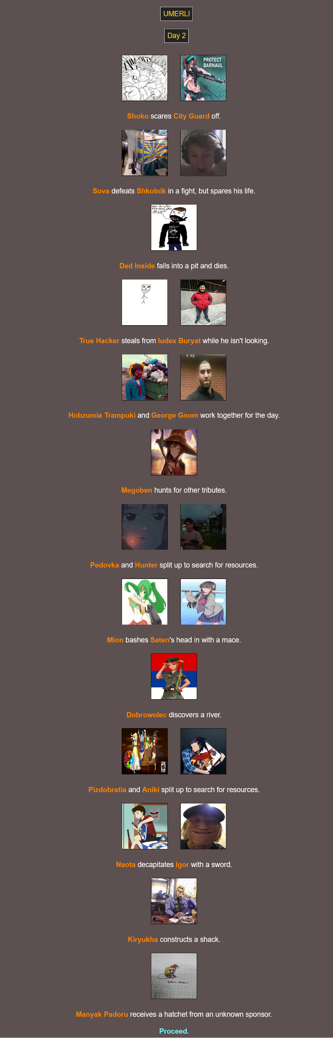 Ничего особого не происходит, кто-то у кого-то ворует, кто-то с кем-то пиздится, всё нормально, разве что Дед Инсайд свалился в яму и помер, Сатэн обронила позвоночник в трусы благодаря Мион, а Наота лишила предводителя ООСД головы.