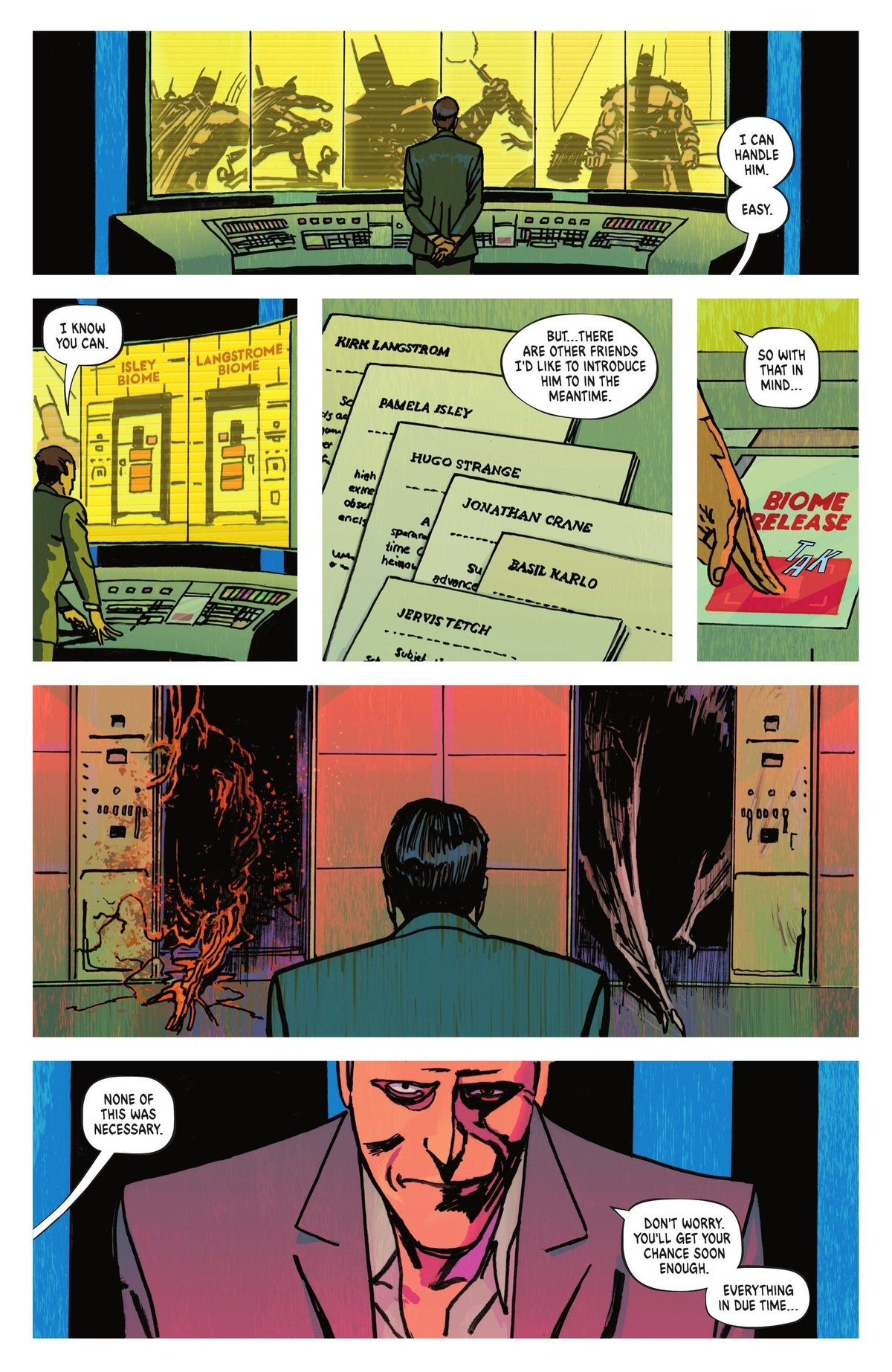 Спецвыпуск оказался скучной херней ну и рисовка не очень, интересные были только последние страницы Нехило на абсолютного бэтса хотят спустить Хьюго Шляпник Плющ-Мэн-Бэт, Пугало и Клея. Правда спускать будут по двое сейчас идут судя по картинке плющ и ленгстром. Ну это интересно будет почитать