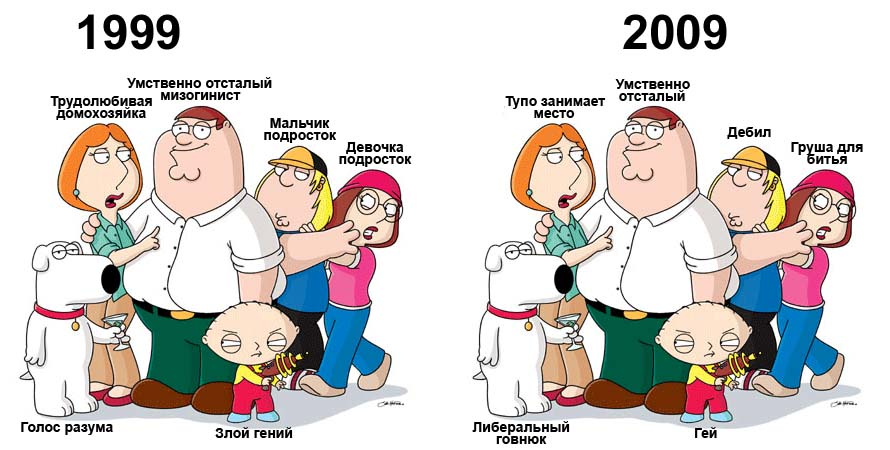 Симпсоны скатились в говно, и если на один сезон будет одна хорошая серия - то уже хорошо. Фэмали Гайс изначально были хуже Симпсонов и вытягивали за счет более пошлого юморка - в итоге скатившись в говнину с гэгами для смешных нарезок Ютуба "Крис трахнул Мэг", "Браин стал геем" и т.д. и т.п. в подобном стиле.