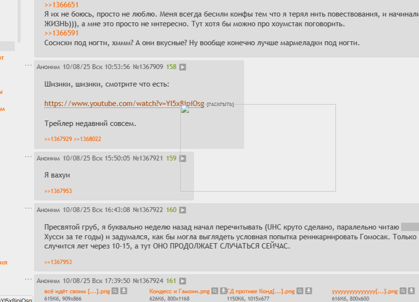 >>1368516 У меня другой вайб… Прости, что испортим им твой. Ладно, я очень плохо говорю приятные и добрые вещи, но попробую. По началу у меня был вайб, которое отражает данное видео https://youtu.be/0ufRVQs_scI По крайней мере в эмоциональном и метафорическом плане. Сцена где Рик выпиливается это прямо как я выпиливался после того как тред решил, что мне тут не место. Пришелец, которого Рик убивает перед собой – это Шизостак/Дружестак. А Джерри, косящий асфальт в конце сцены – Автор 2007стака. А сцена в конце, где Рик и Морти хоронят свои мёртвые версии эталон фразы “ВСЁ ИДЁТ СВОИМ ЧЕРЕДОМ”. Это как будто мы хороним трупы своих друже-шизо личностей и понимаем, что они уже в прошлом и мертвы и теперь не вернуть всё как раньше. Когда Морти проходит между семьёй и они как обычно ругаются или чиллят от этого прямо такой вайб ВСЁ ИДЁТ СВОИМ ЧЕРЕДОМ несмотря ни на что. Жизнь продолжается. Тред умер, как и форсы. Мы просто мотали нервы друг другу. В итоге все соснули. Застряли в шизе. Ну вы поняли? Ну это мысли поначалу. На самом деле здорово было увидеть старых приятелей. Я не прикасался к Хоумстаку лет шесть и забыл и про шизу и про дружу и про сам комикс. У меня много чего за это время произошло. После трейлера заглянул к вам и меня расплющило от ностальгии. Накрыло прямо. Будто бы капсулу времени открыл. Вспомнил сисечников и попочников даже. Даже Землю Санникова, которую обещал прочитать ГД, но так и не дочитал. Я не помнил обо всём этом так долго? Наверное, это ну как что-то неприятно в бессознательное ушло. По крайней мере когда я уходил, то обо всём этом забыл и считал всё произошедшее большой тратой времени. И вы тоже в треде, вау. Так приятно было с вами початиться, хотя и немного. Я очень рад вас всех встретить. Розмари, БОП, НепетаШизик, ГамзиДруже, Автор 2007Стака(ого? интересно, он шизик или друже?), Экстрим… Я думал, мне будет неприятно говорить с Кисо-сисечником, ведь мы поругались. А в целом всё вышло нормально, даже практически меня не травил. Но с ГД было особенно приятно говорить, жаль он как гук партизанит ебуче. Надо его сисястыми троллесамками выманивать. https://youtu.be/bNnfuvC1LlU Так, что скорее это видео вайб отражает. Хоть на какое-то время почувствовал старый тред. Пойду что ли сока въебу гранатового и наконец поймаю грибную фею Макс Пейна. В капче знак Канайи попался, не успел заскринить.