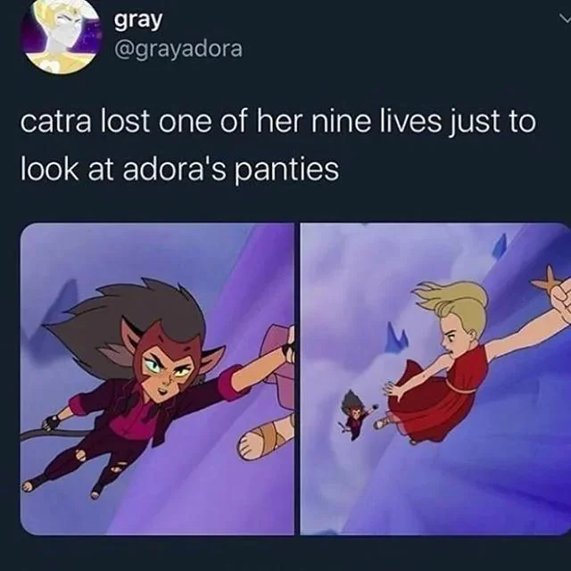 >>1322596 >Зато тут есть бухая Адора И Катра выглядит как... well, CATra, а не дешёвый аниматор с детского утренника, которого будто специально попросили дико переигрывать свою кошачность.