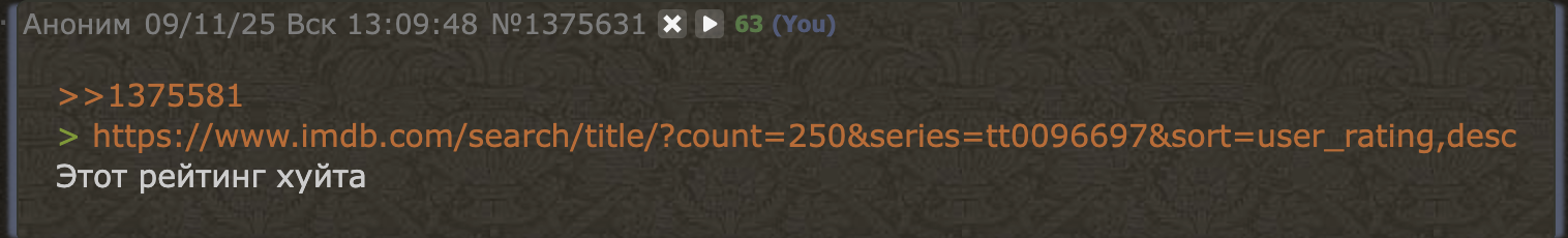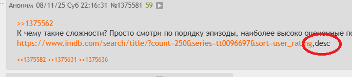>>1375581 > К чему такие сложности? Просто смотри по порядку эпизоды, наиболее высоко оцененные посетителями крупнейшего в мире киноагрегатора: Ебать ты умник. Я уже думал такую стратегию как-то использовать. Посмотрел первый эпизод из списка. Блеванул и выкинул идею в помойку