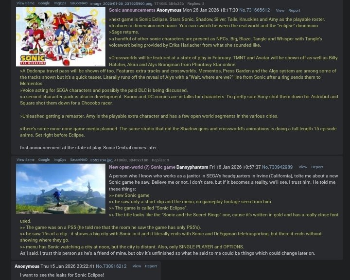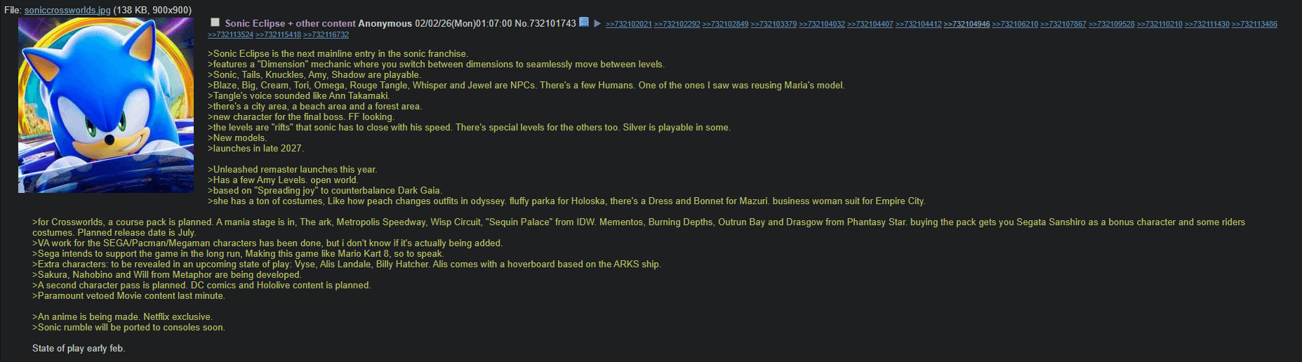 - Новая игра для сосолей (ПК почему-то не заявлен), Фронтирс-стайл, но в большом городе, поделённом на острова (как в гта вайс сити лол). Альтернативное измерение, Соник и Шедоу играбельные персы, Эггман и Сейдж в сюжете. ВЫПИЛЕН БУСТ (тут 100% фейк), вместо него механика "Burst", сай-луп и спиндэш. Бесшовное перемещение между уровнями. Все упоминают название Sonic Eclipse (скорее всего, рабочее). Игру хотят показать на State of Play СКОРО (в феврале).