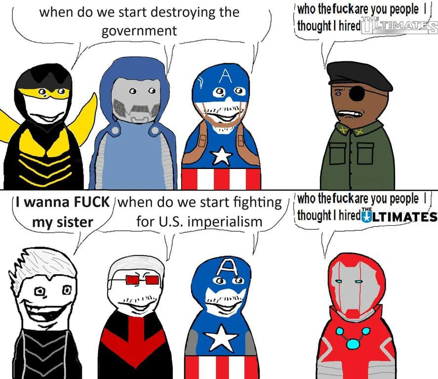Алтимейтс 2 2005 ебать жидкий кал. Единственный норм персонаж Тор и его сюжетка, много ненужных смертей, много духоты, сплошь рояли в кустах и фаст форварда типа Пим бомжара и вдруг он наделал 500 альтронов, пиздец Как и в первой части финал битва побеждается за пару страниц, лэйм Мне показалось или хачей хотели показать норм людьми? Это же одни террористы, которых нужно ебашить по полной.