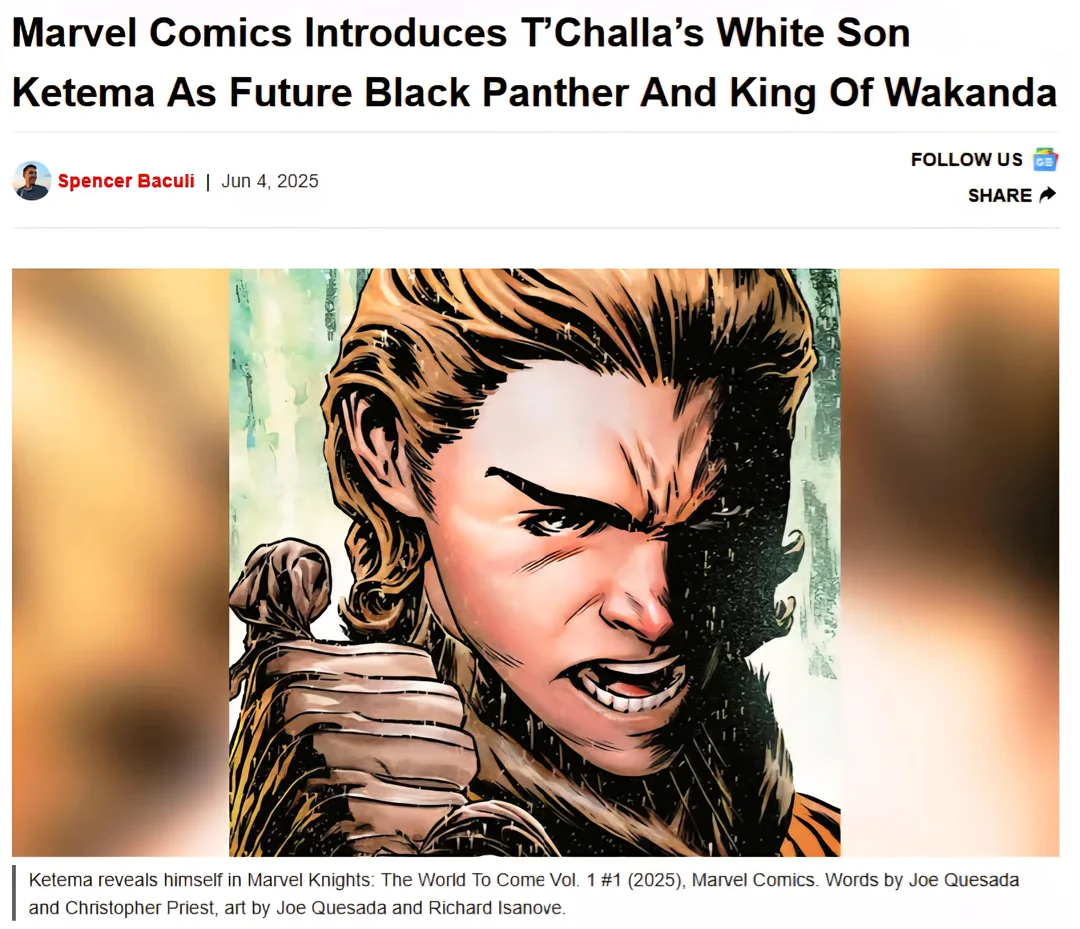 >>1361949 С учетом того, что пишет Прист, который сам чёрный и не любит, когда его ставят чёрных персонажей писать (в DC хотели, чтоб он про Киборга писал, но он их продавил, чтоб ему Дэфстроука дали, и в итоге вышел по современным меркам шин), то вряд ли.