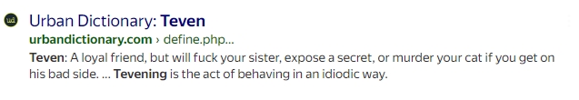 >>1375993 Очевидно, он вместо "Стевен" читает "тевен": "С" слишком нетипично выглядит. Что такое "тевен", я не знаю, яндокс тоже ничего на самку собаки похожего не даёт, но вот урбандикшонори что-то отдалённо похожее знает.