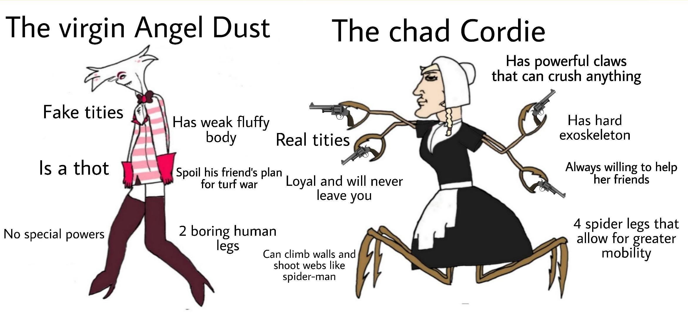 >>1370233 >Аластор асек Вкурсе. Но он по прежнему чем-то эстетично с Лилит смотрится в алых чулках