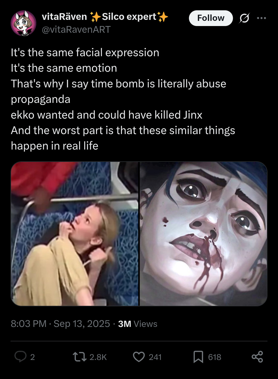 Фанатам Джинкс вообще нормально, что их вайфу, их любимую малышку, жестко отодрал во все щели какой-то быдловатый негр, так еще и в нескольких временных линиях?