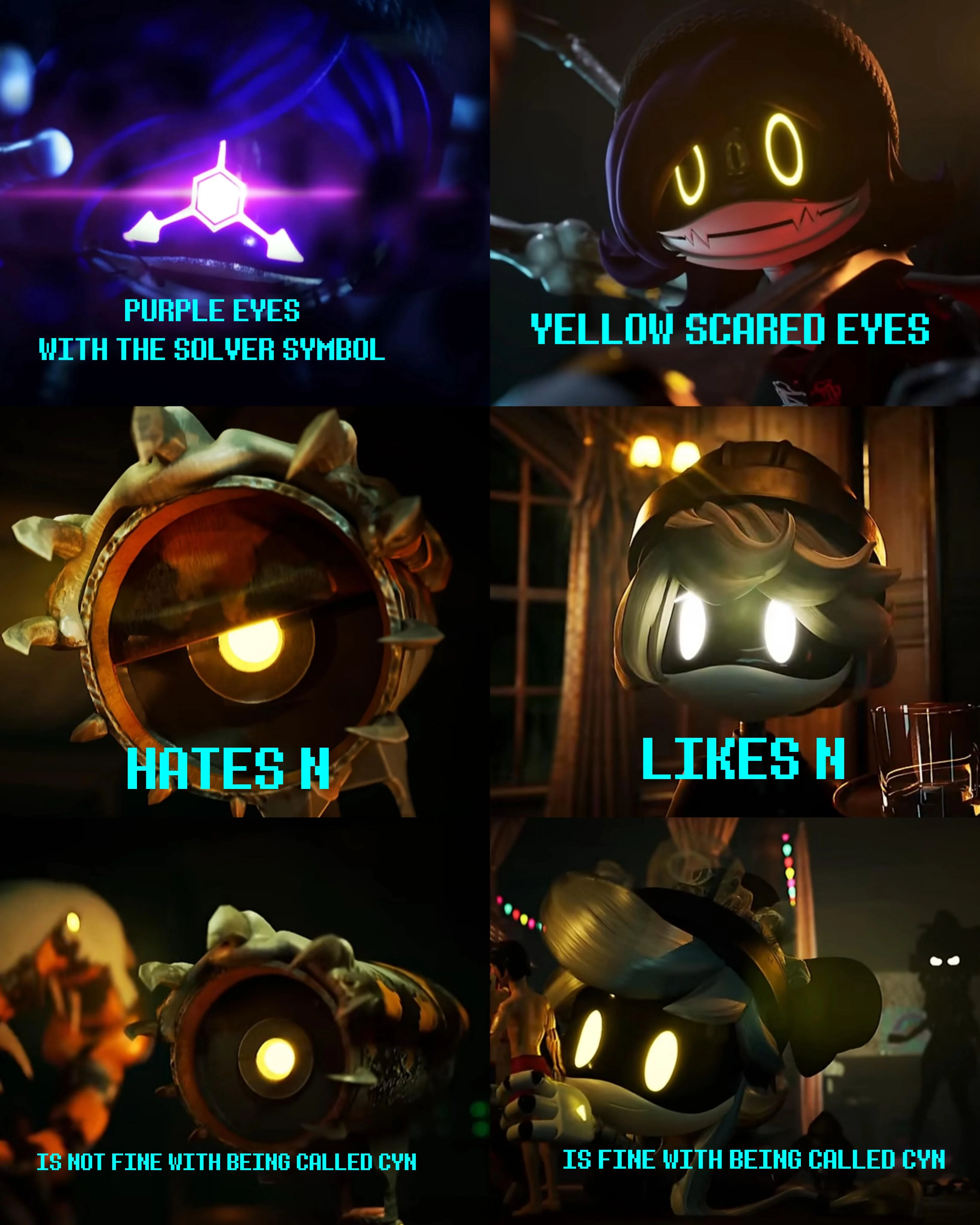 Личности Солвера и Син переплетены, но явно не тождественны. Солвер влияет на Син, превращая её желание наказать обидчиков в желание уничтожить нахуй Вселенную; а Син влияет на Солвера, заставляя робо-Сатану тупить и играться в куклы вместо прямого движения к цели по методу летящего ломика. Син ни разу не показывалась из-под Солвера, потому что... она и не борется, чо. Солвер её не выбрасывает — её всё устраивает. Она лишь вносит коррективы в его поведение, без выраженных бунтов: то к Эну особое отношение, то бэкапы именно для троицы её самых близких дронов (вернее, самого близкого, подруги самого близкого и Джей), и Тессу она по-своему оберегала (зря она восстала, канеш).