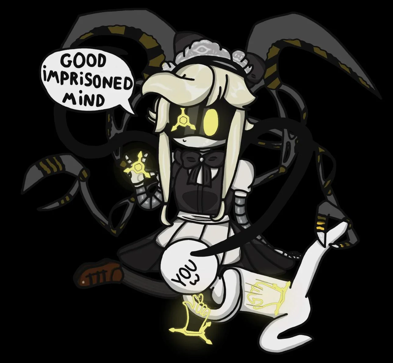 Так никто и не говорил, что Син невинная овечка. Солвер лишь усиливает ЕЁ желания, с поправочкой на свою дьявольскую сущность. Как злой джинн, только с опцией прямого влияния на хозяина. "Меня и моих знакомых дронов хотят выбросить? Жёлтый троян, надо этих людишек наказать. (ВЖУХ) Отличная идея — уничтожить человечество, хи-хи-хи :) " Эн добрячок — и Солвер нихуя не может с этим поделать, за пределами коротких сессий одержимости он всё равно добрячок. А вот ту же Узи вштырило конкретно, потому что и сама грешна.