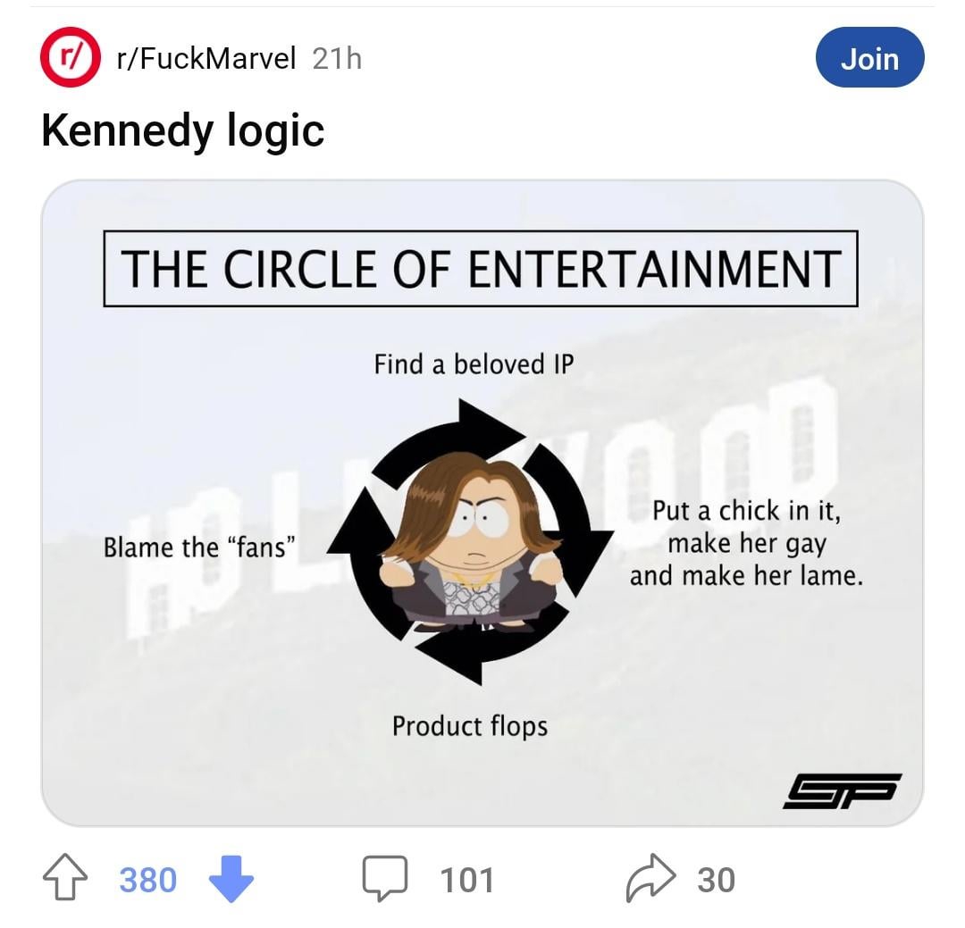 >Утверждение ложное. >Кэтлин Кеннеди, которую поставили во главе франшизы - это и есть типичная жируха. Наоборот ты ложно приравниваешь циничного управленца Кеннеди к девочкам, которые нынче ходят в кино на караоке версию Кей-поп Охотниц. Тем более что над Кеннеди стоял ещё более циничный управленец белый мужик Айгер, который сказал сиквелы ЗВ как можно выпускать - ну подчиненные и понеслись. Им же спустили сверху тему с тем, что надо дайверсити персонажей вставлять - они и вставили. Ну и переходя к разнице, которую ты не понимаешь - если креативные манагеры думают (ну или не думают, но вынуждены следовать указания свыше), что что-то зайдет жирухам, это ещё не значит, что это правда, негр-штурмовик на центральной роли и задвигание старых героев из очевидного. Рейло же на контрасте зашло достаточно широкой прослойке аудитории, так как это проверенная сюжетная схема (благодаря которой те же Сумерки столько заработать смогли), но даже её Абрамс в девятке похерил.