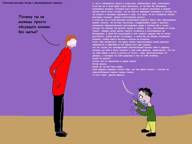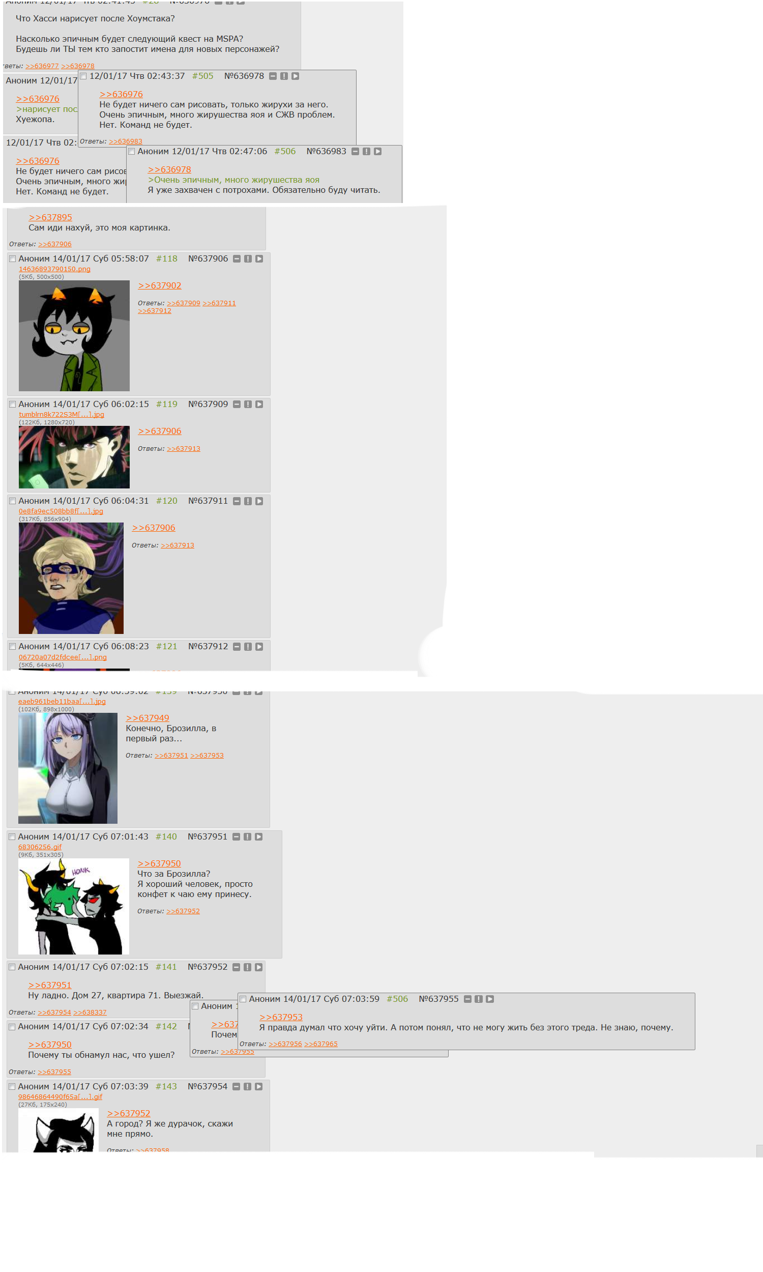 >>1369898 >Звучит страшно. Я напуган. Я очень давно форсил суицидстак в треде. Оказывается, очень много персонажей комикса выпилили себя. Бефорувские тролли, например, коллективно себя подорвали. Трудно персонажа вспомнить, который бы не обладал такими наклонностями, Мэр только на ум приходит... Но мало кому такие обсуждения зашли. Помню только мне кто-то, кажется ГД, пытался доказать, что Дейв не суицидник, лол. Вообщем, мне надоело и тема заглохла. Ну это было в 2018-2019 годах. >Ну я то хочу супер ышди как коллайд какой-нибудь. Коллайд всратый. Пластилиновая битва ничо так, в ней хотя бы стиль однородный. >Ну они куда-то делись, разве нет? Я про тех, что остались. Ну знаешь их 8 было, а 4 в домике. У Калиборна есть станция для рисования комикса. Я думал, дети будут свой комикс делать и всё такое. Ну, от части так вышло, но они владеют повествованием через мысли. >Нет, такое ощущение что они специально издеваются над основным комиксом с первых страниц. Не осилил. Ого. Иронично издеваются, как Гомосрак? >Нет, просто она хороший тролль, и все её неправильно понимают. Она же Тавроса ног лишила и убила. Это хорошо? И Арадию тоже. И Терези ослепила.