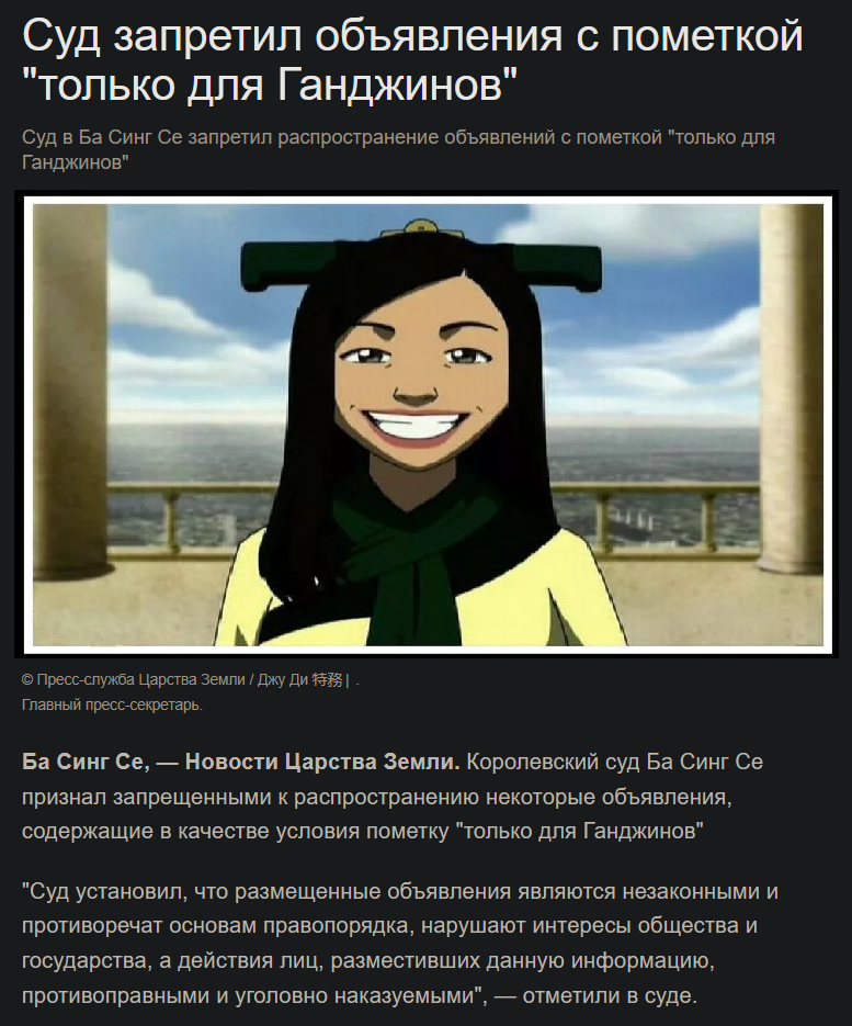 Корра же ребёнок королевских кровей и изначально должна была быть наследницей Северного племени воды, ну в итоге понятно - батю изгнали, хуё моё и она родилась в чуханской семье на южном полюсе, но потом то батя её в итоге стал Вождём южного племени воды и отгрохал себе огромный дворец, который нам собственно показывают в 4 сезоне когда корра лечила свою инвалидность. Ну так вот, Корра как Аватар вообще может вступать в своё законное наследство как правитель, если захочет или аватарам такое нельзя, а если нельзя, то почему и на каком основании. Ведь батя у неё не вечный, а других детей у него нету, а поскольку, как мы знаем на примере Северного племени воды - власть точно передаётся по наследству, как например перешла к Эксе и Десне, когда их батя откис. Или там просто будет какой-то совет вождей и такая себе племенная демократия, которая выберет кто дальше. Ну просто любопытно, вот у нас есть пример, что аватар в принципе может забить на всё хуй и пойти работать чиновником, как было с одним аватаром из царства огня. Или забить на всё и создать своё квазигосударство с культом личности, как сделала Киоши. Так что может ли теоретически аватар быть правителем одной из стран. А то, ну это какой-то хуёвый повод прерывать королевскую династию, родители же не виноваты, что у них аватар родился, а других детей нет