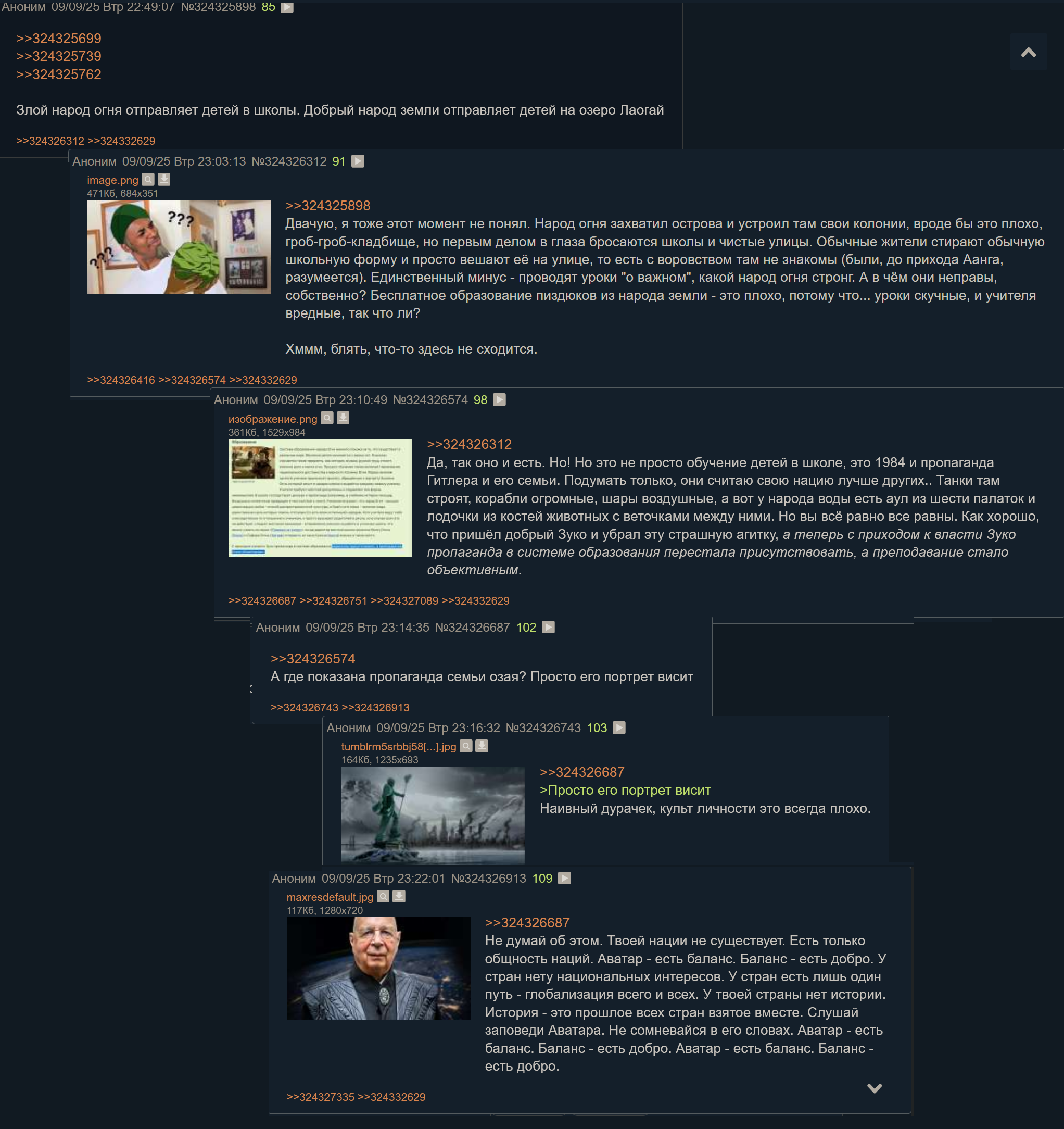 >>1372397 >Дальше что? Поставили бы новым Лордом Огня Айро, ибо у Зуко тогда ещё дурная репутация была. Далее пошли бы по привычному сценарию: вывод войск из Царства Земли, решение вопроса колоний и т.д. >>1372398 >Люди до нашей эры умели затмения предсказывать. А к вселенной мультика это как относится? >Ну из всей этой тирады я понял, что Аватару можно делать все Ну а я понял, что для тебя использование записей духа против его воли для прекращения кровопролитной войны равняется какому-нибудь геноциду. >Я думаю Озай дольше смог бы продержаться. Терпел от Зуко с двумя мечами, но надрал бы зад аватару с тремя стихиями? Ты серьёзно?
