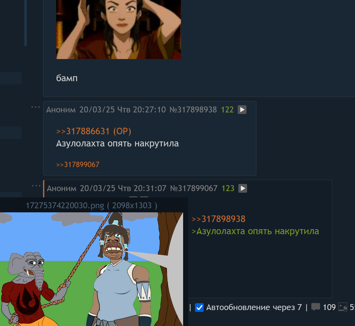 К слову двух-трëх сообщений в день хватает для того, чтобы удерживать первое место в /c/. Вот уже больше года Аватаро-треды в лидерах по бампам. Вот и думайте головой, теория мëртвой борды