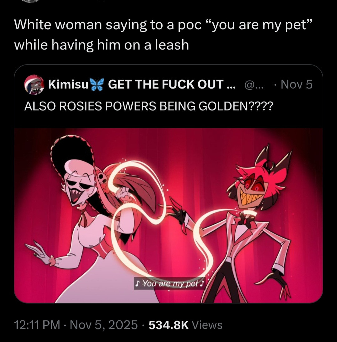 Я два сезона ждал, пока раскроется, что Вельветка с ее владением соцсетями - самая сильная Вэшка, потому что порнуха не влияет на сердца людей, а телевизор вообще никто нахуй не смотрит, зато соцсети задают по факту тренды, поведение и бытие масс. Ждал и не дождался. Полагаю, этот один пинок Вокса - самое интересное, что она сделает за весь сериал