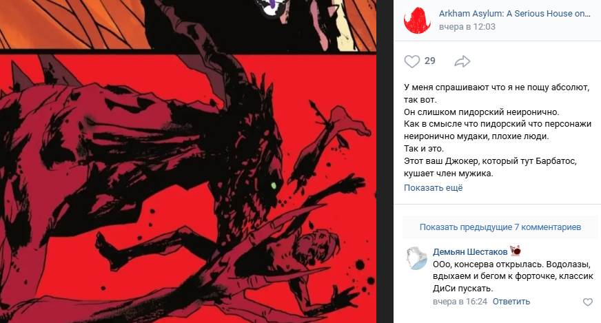 Почитал абсолют бетмена, ну и он слишком пидорский неиронично. Как в смысле что пидорский что персонажи неиронично мудаки, плохие люди. Так и это. Этот ваш Джокер, который тут Барбатос, кушает член мужика.