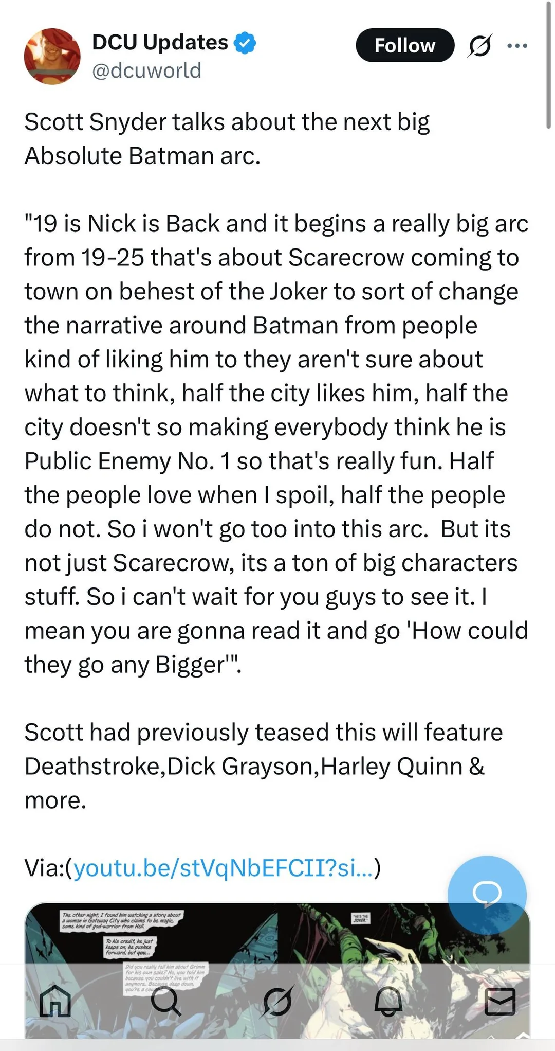 Спецвыпуск оказался скучной херней ну и рисовка не очень, интересные были только последние страницы Нехило на абсолютного бэтса хотят спустить Хьюго Шляпник Плющ-Мэн-Бэт, Пугало и Клея. Правда спускать будут по двое сейчас идут судя по картинке плющ и ленгстром. Ну это интересно будет почитать