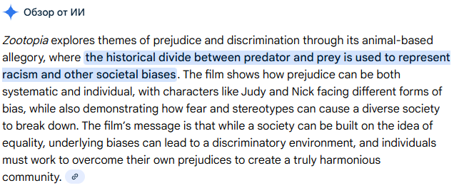>>1378136 В этом и прелесть мультфильмов про зверян. Потому что их можно интерпретировать как угодно. Выдумывать чем раса является, а чем не является. А потом еще заниматься ментальной гимнастикой, натягивая эту условную классификацию на мир людей, в котором опять всё не так работает. Если только уж совсем очевидные вещи прямым текстом не начать проговаривать. А в любых других случая легко вывернуть факты наизнанку и представить их в противоположном свете и отправиться в область "Вы неправильно поняли Х. Что же на самом деле хотел сказать автор"