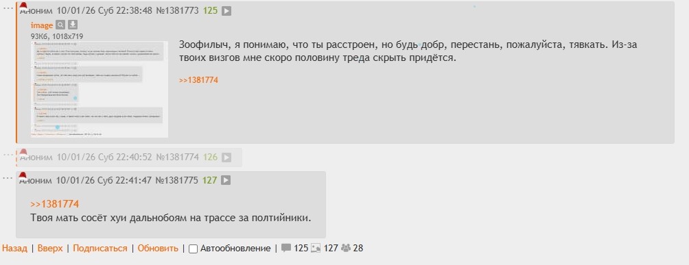 >>1381776 Пришёл в мой тред, скрыл мои посты теперь читает про сосание хуёв и матерей в вперемешку со своими высерами как же ему не похуй. В предыдущем треде дела точно так же. Просто превосходно