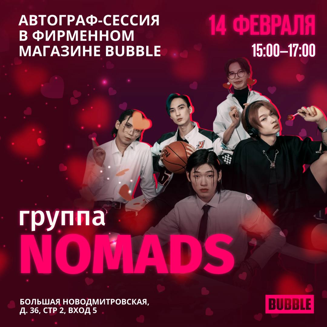 >14 февраля не могло пройти без крутого мероприятия, поэтому мы приглашаем вас к нам в Базу на автограф-сессию с популярной казахской группой NOMADS! Пятёрка ярких парней будет ждать вас, чтобы подарить улыбки, лучи любви и автографы!