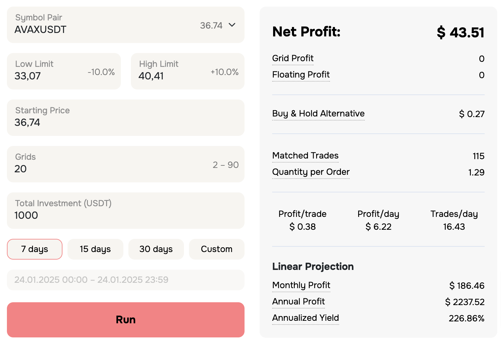 во-вторых, бота корректно сравнивать с бенчмарком ходл 50%токена/50%стэйбла, ибо непостоянные потери, которые будут при выходе из границ, съедают нихуевые проценты прибыли.
