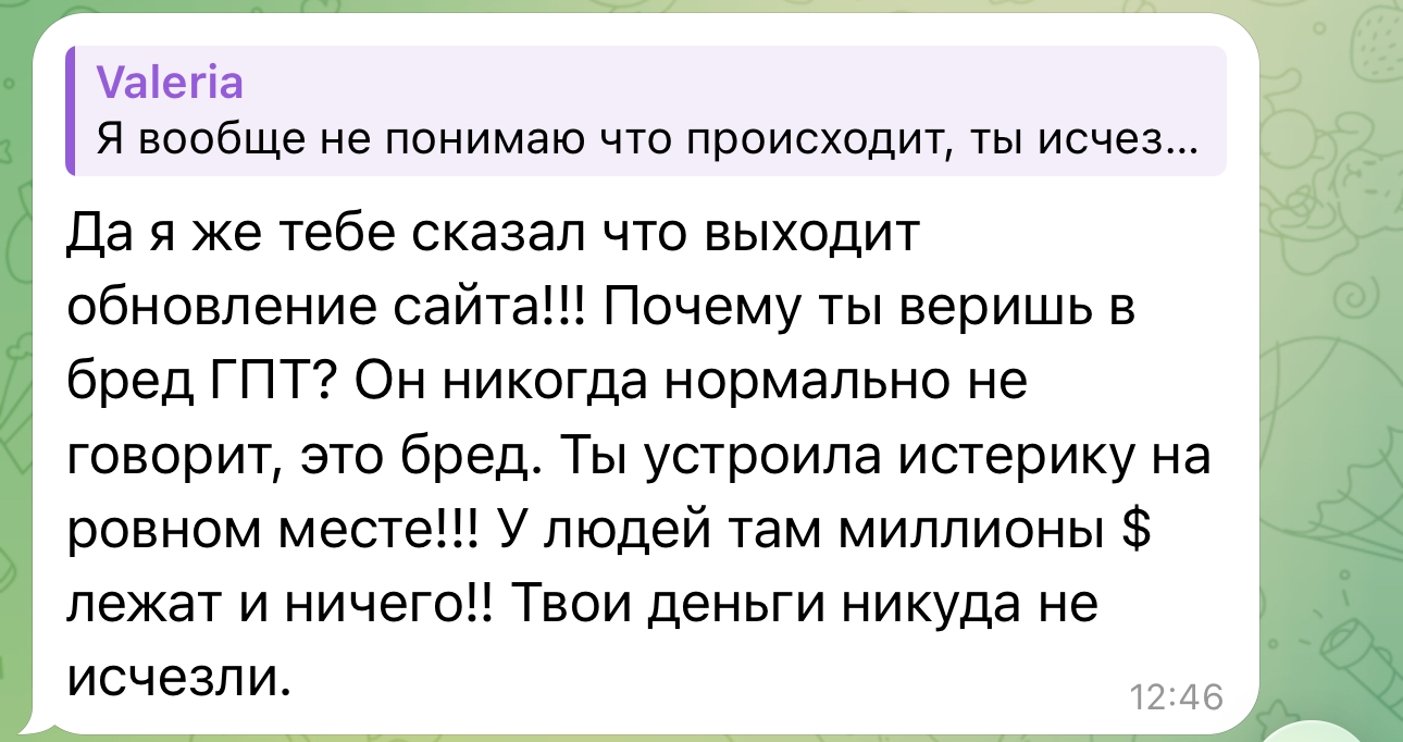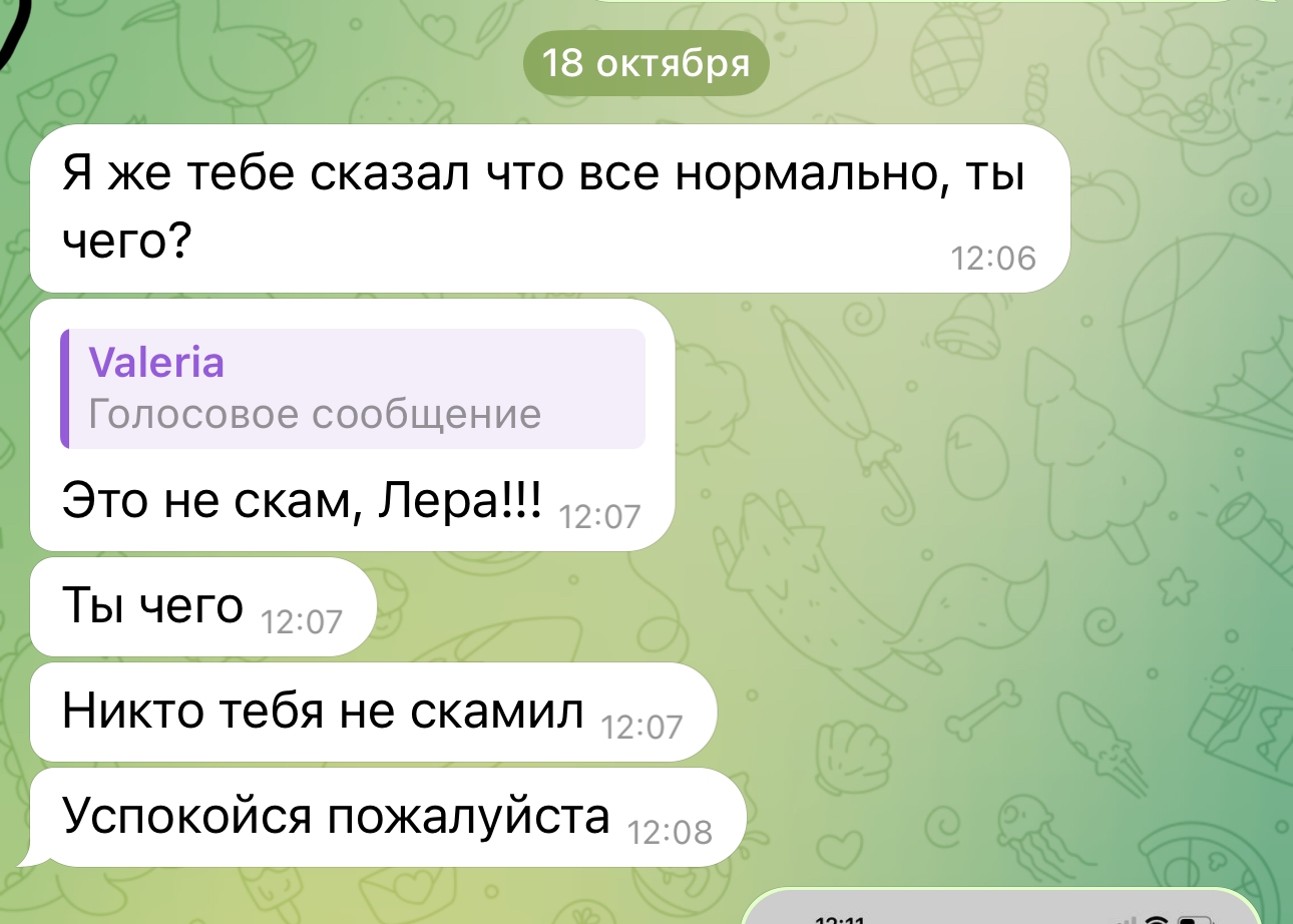всем привет, знаю, я полный лох. долгое время меня обрабатывал новый знакомый, мы с ним «подружились» и он захотел мне помочь. у меня маленький опыт в крипте. в итоге меня заскамили на круглую сумму. конечно же поддержка вряд ли что то сделает, но у меня остался тг аккаунт этого человека. скорее всего, да очевидно, что он фейковый. можно ли что то сделать? найти его как то? мне грустно, поплакала, но урок усвоен и я свыклась с этим уже за неделю, но не покидает мысль что это нельзя оставлять просто так. если ошиблась темой, прошу прощения, я тупая