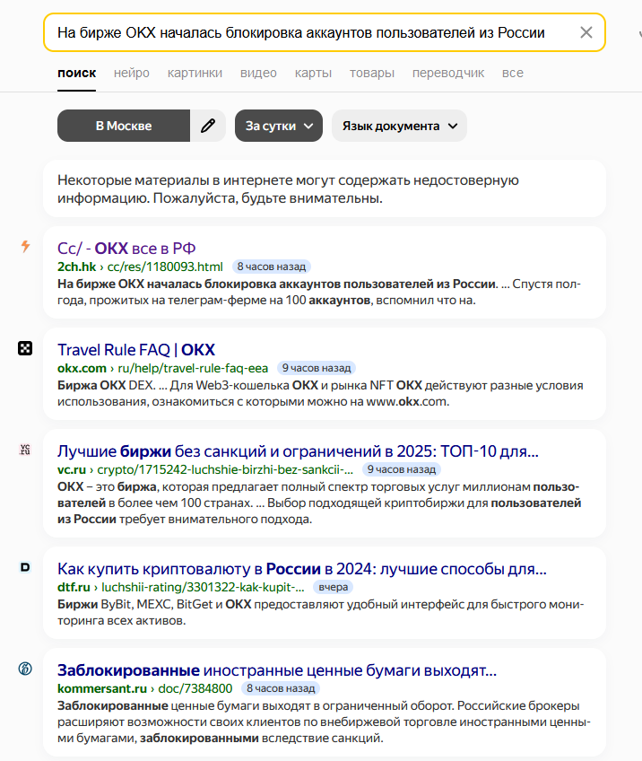 На бирже OKX началась блокировка аккаунтов пользователей из России. А также требуют пройти верификацию во избежание блокировки аккаунта и денежных средств. Просят подтверждение ваших доходов и поступления денежных средств. Многие пользователи начали выводить свои активы.