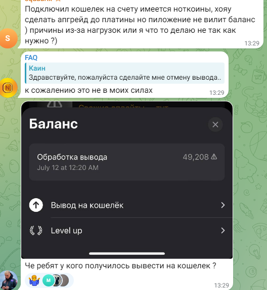 Подскажите, в тг боте у меня баланс Нота, пытался вывести его на привязанный Тонваллет за 300 монет, транза процессинга висела 9 дней, после этого меня бросило с сильвера в бронзу и баланс вернулся на кошелек, теперь вывод неактивен. Есть сеймы и что с этим блять делать?