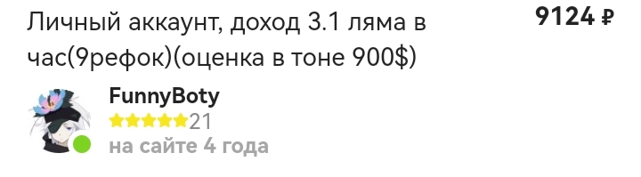 >>1094777 9к за аккаунты которым чуть больше месяца которые можно было сотнями заряжать подрубая ботов или вручную раз в день покупать карточки. никакой гарантии что акк не снесут за ботоводство, продавец рискует только рейтингом (ничего не мешает тому же продавцу крутить стаж и отзывы на запасных аккаунтах)