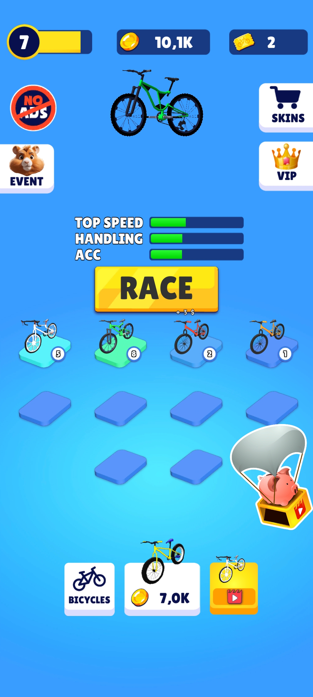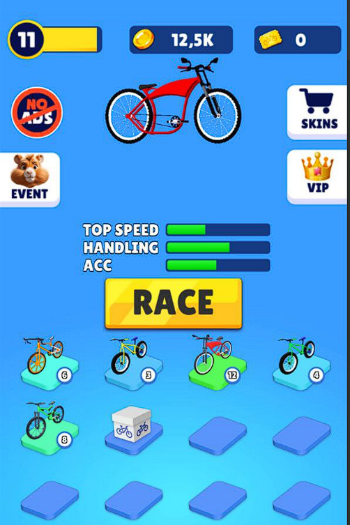 Важно. 1. Поскольку рекламы нет при сборе велосипеда, не обязательно покупать дорогие из коробок. Можно купить 20 штук 3 уровня например, быстро прокликав собрать тот же велик гораздо дешевле. 2. Не надо сразу собирать велосипед 20 уровня. Покатались один раз на, условно, 3м уровне, апнули его до 4 уровня и опять покатались.