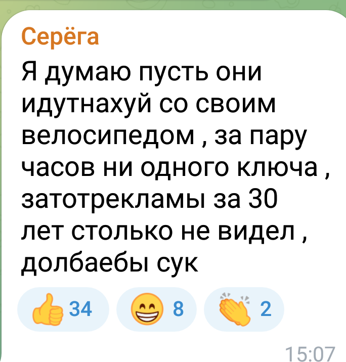 Положняк по ключам 1. Все взятые ключи в пятнашках и все взятые ключи в велосипедах без рекламы - авторитет 2. Некоторые взятые ключи в пятнашках и некоторые взятые ключи в велосипедах без рекламы - мужик. 3. Забивший хуй на ключи, велосипеды и хомяка - ровный пацан. 4. Не взятые ключи в пятнашках при наличии гайда и попыток - ОП прошлого треда. 5. Хоть один взятый ключ в велосипедах с рекламой - чухан.