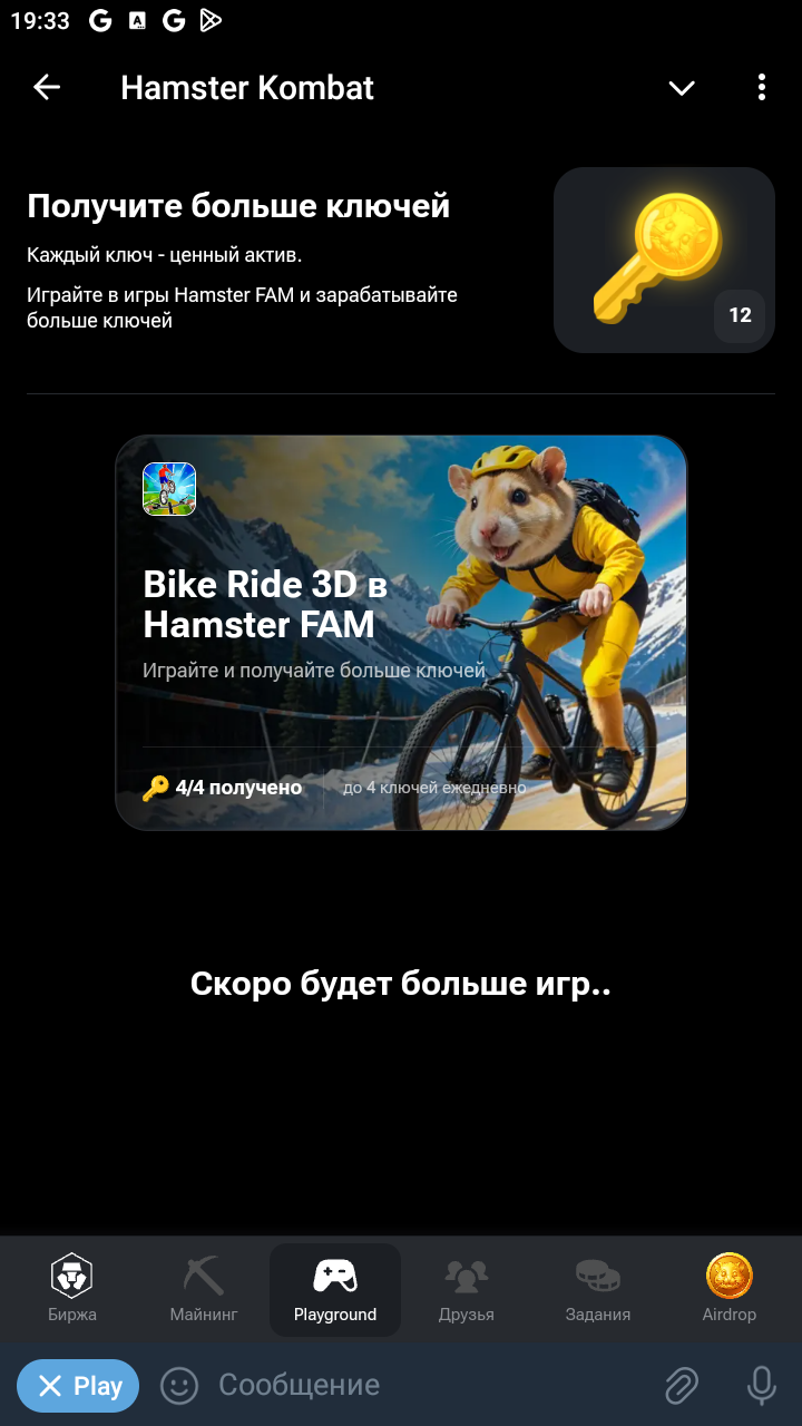 минут 40 рекламы без игры, и вот +4 ключа и минус немного самоуважения, и так ежедневно. пойду искать 10 рефа, всем удачи, и помните - хомяки это сила!