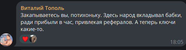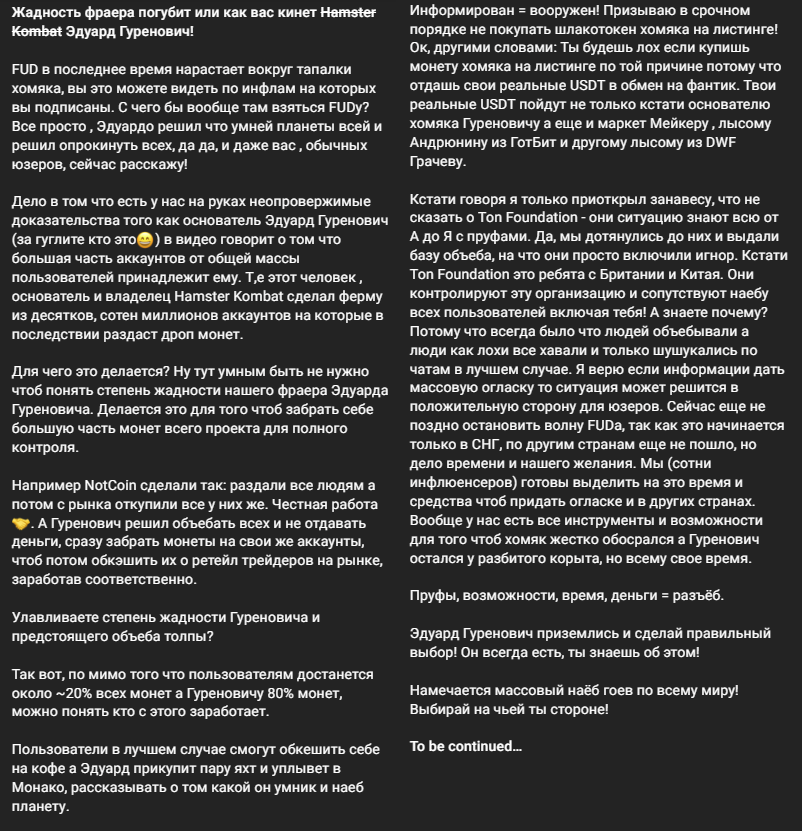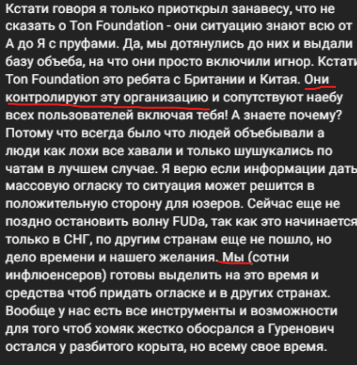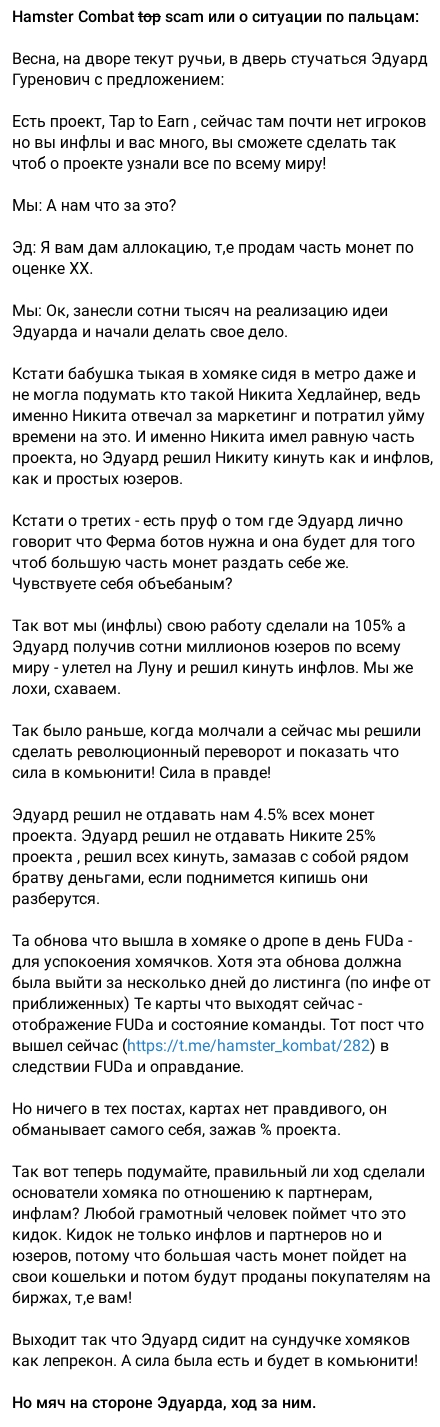 Разрабы хомяка кинули инфлюенсеров, сделав им рефанд вместо 400 иксов. От чего у многих полыхнула срака, и сейчас они призывают бойкотировать хомяка, а Гуриновичу похуй - гребет по $500k в день на рекламе и в хуй не дует