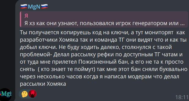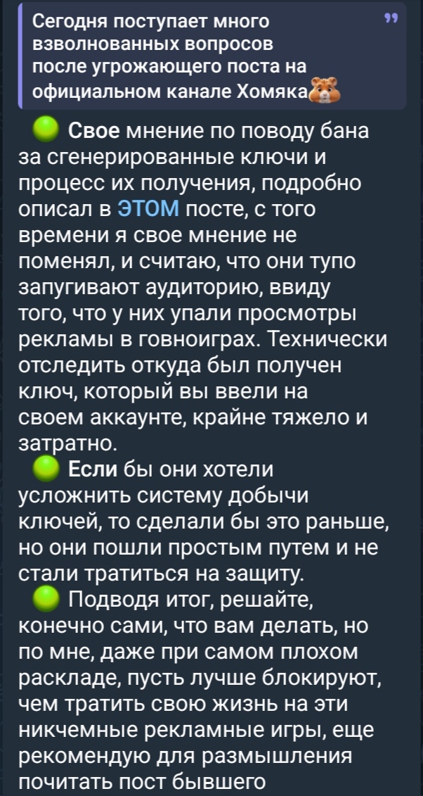 Добрый день, хочу донести до хомяков информацию о том, что мы с завтрашнего дня начинаем блокировать всех тех, кто добывал ключи при помощи генераторов. Даю вам последний шанс перестать ими пользоваться.
