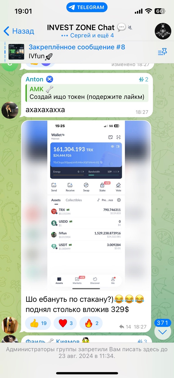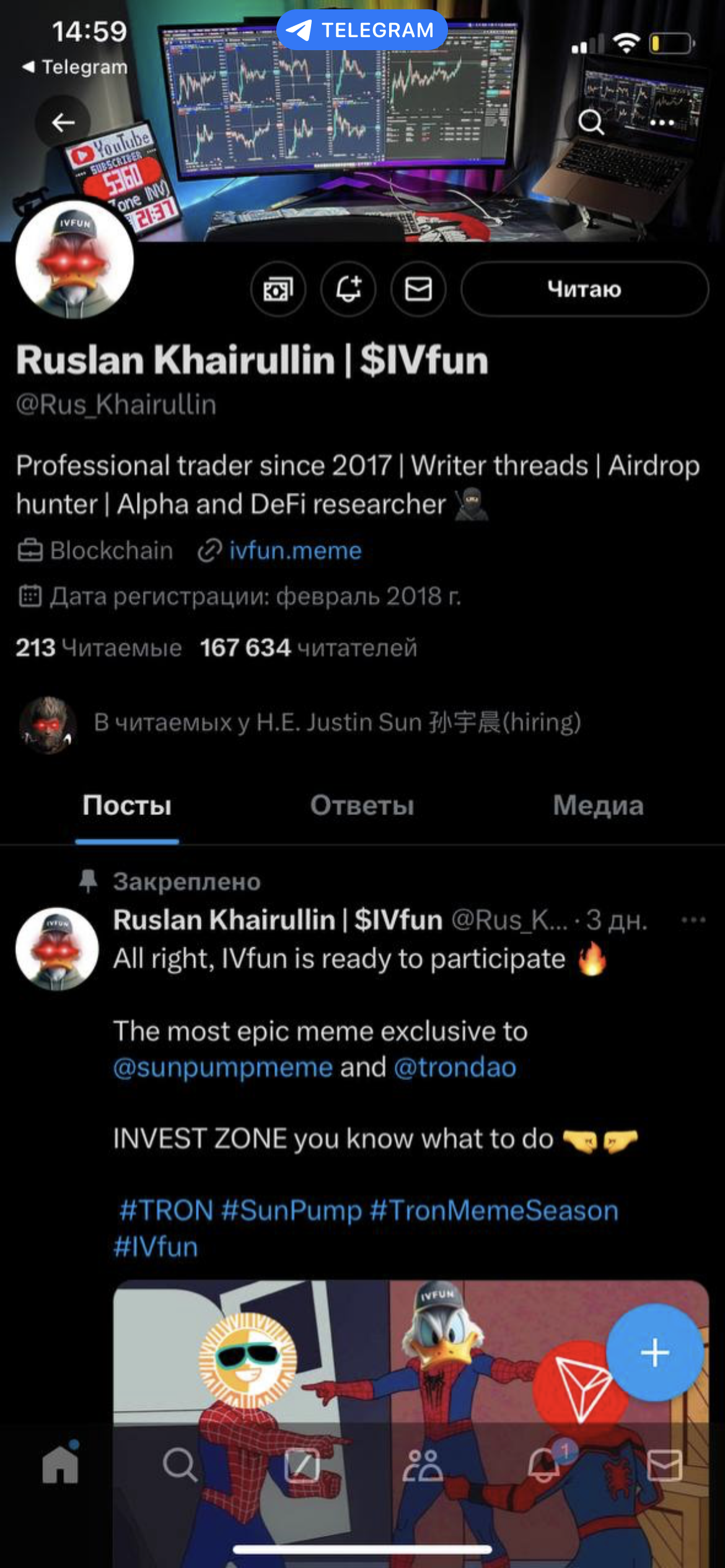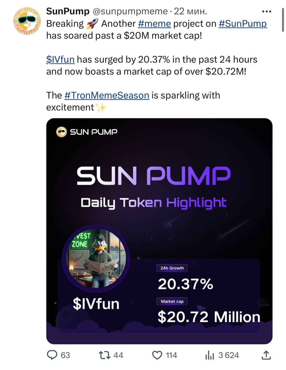 Justin Sun замутил свой ЩитПад на Tron В сети TRON создали платформу для запуска мем-токенов под названием SunPump 17.08.2024 наш, российский криптан - Руслан Хайруллин с аудиторией в 2.3кк запустил свой щиток под названием IVfun, которая за неделю в пике брала капу 70кк вечнозеленых... 25.08.2024 состоялся ахуеть листинг на бирже Bingx, в данный момент идет не плохой пролив, можно залететь по скидке. Так, что анон? готов ли ты к лайфченджу? Ниже буду публиковать новости, ссылки, гайды итд.